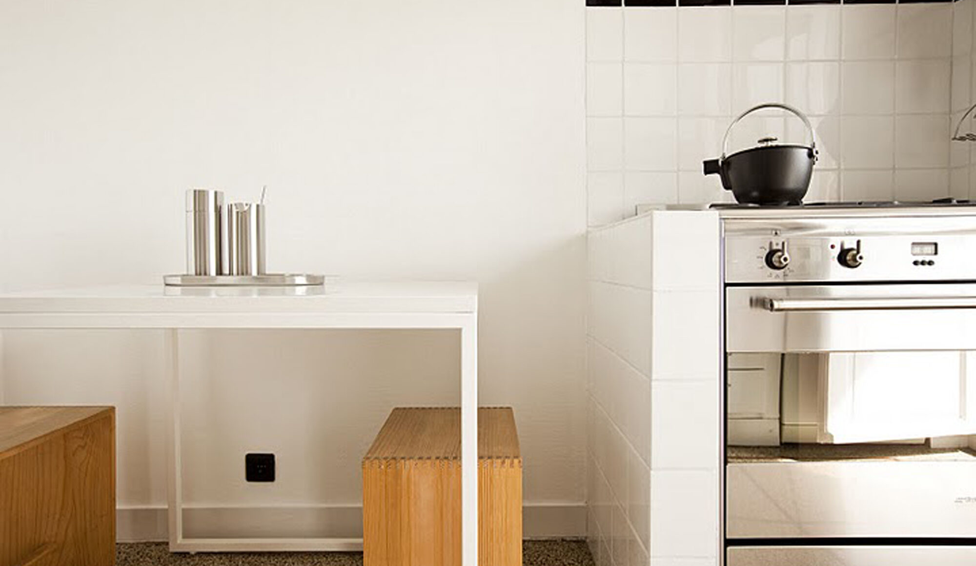 Épurée et fonctionnelle, la cuisine conjugue façades blanches, accents en inox et sol en granito classique. La simplicité des matériaux met en valeur la noblesse de la mise en œuvre. Une banquette en bois et une table en métal s’intègrent avec discrétion à l’ensemble. Attenant, un balcon intime s’ouvre sur la ville et les frondaisons du square — parfait pour un café matinal ou un apéritif au couchant.