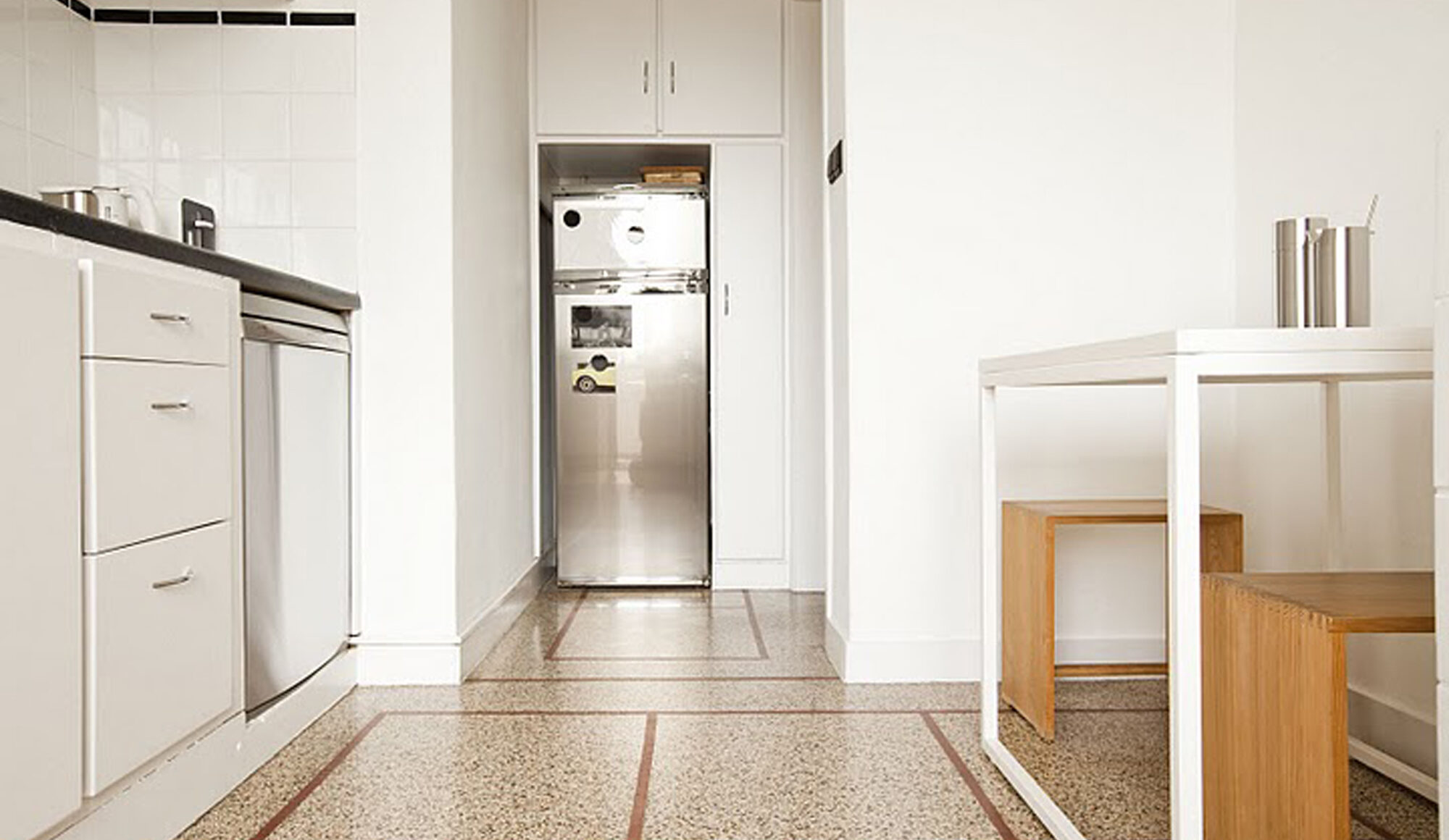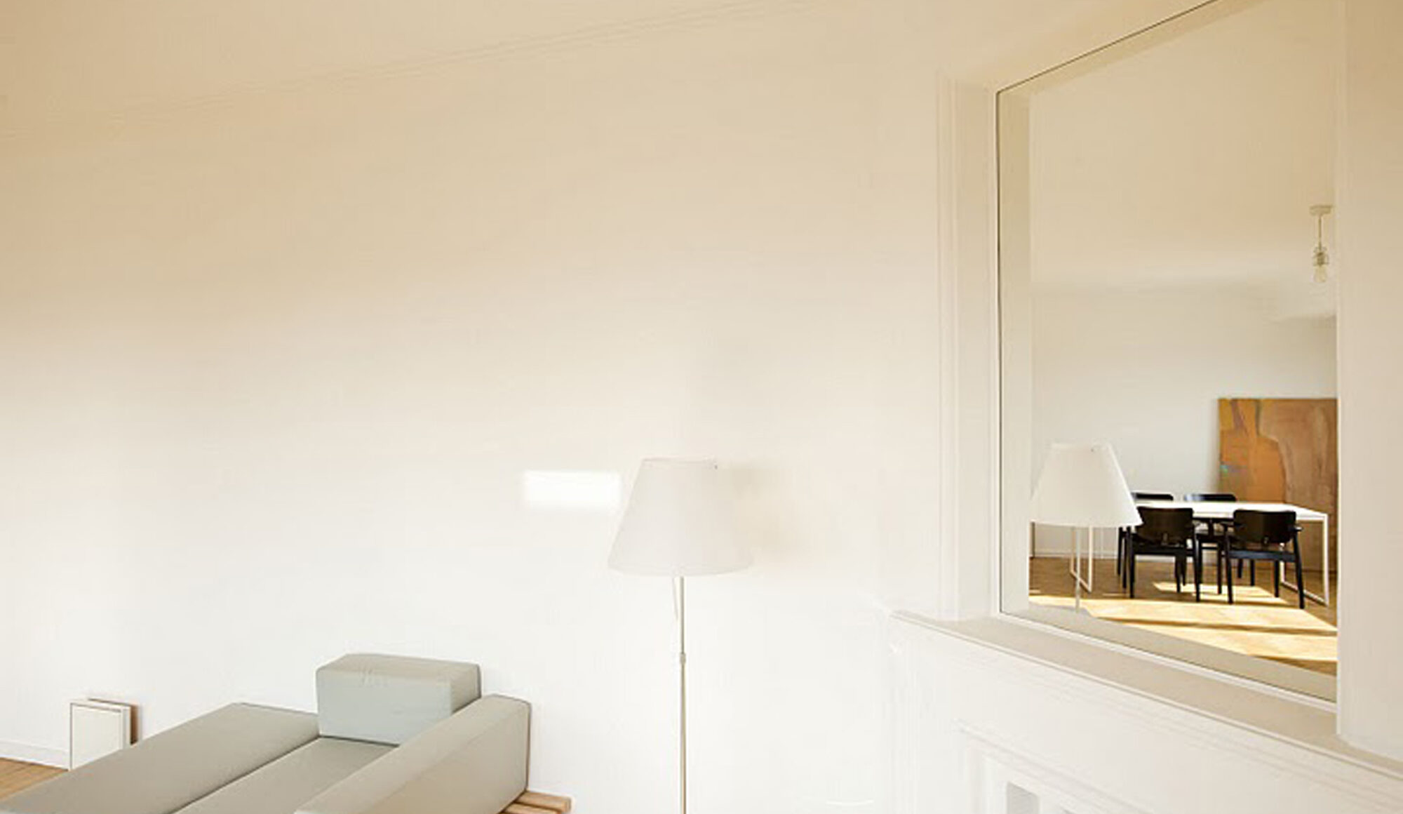 Le séjour s’étire le long de larges baies vitrées orientées plein sud, où la lumière naturelle vient réveiller le parquet en point de Hongrie. Lignes pures, teintes douces et mise en scène aérée forment un espace presque muséal. Une tranquillité visuelle renforcée par l’écriture architecturale Art Déco du bâtiment, perceptible jusque dans les passages voûtés et les détails soignés.