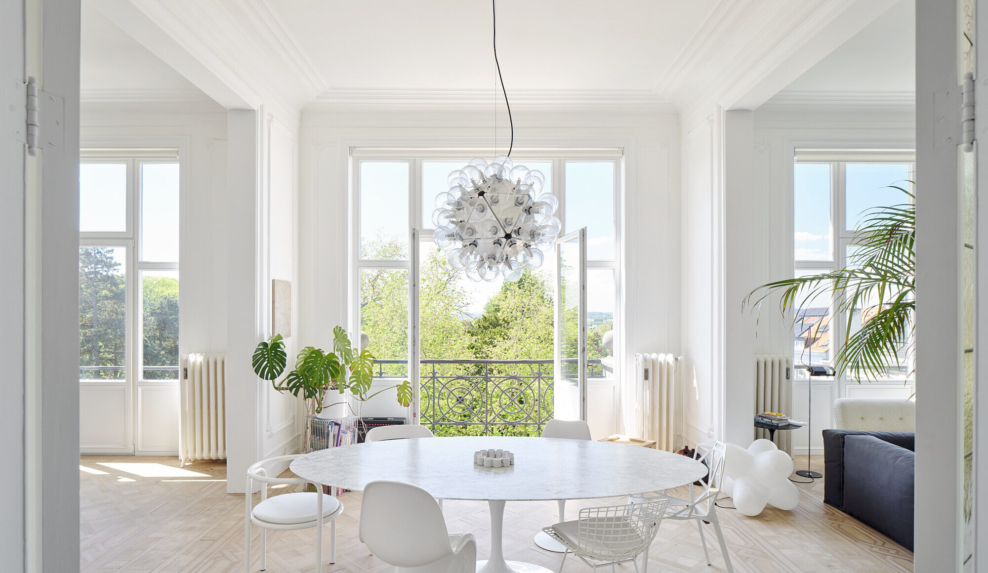 Au troisième étage, l’entrée élégante mène à une enfilade de pièces de réception baignées de lumière : salon, salle à manger et cuisine se succèdent naturellement avec vue imprenable sur la verdure. Parquets en chevrons, moulures d’origine et vitraux sont soigneusement conservés, posant le décor d’un intérieur raffiné.