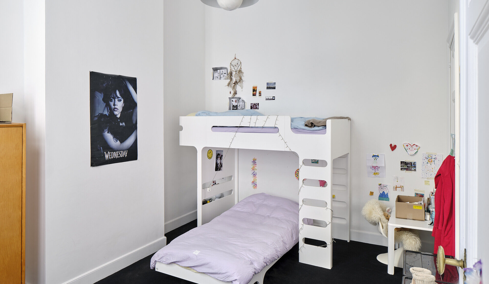 À l’étage supérieur se dévoile un espace à la fois intime et inspirant. Une quatrième chambre y côtoie une salle de bain indépendante, un WC séparé et une vaste pièce aujourd’hui aménagée en bureau. Une mezzanine-bibliothèque, un grand espace de rangement et un long couloir complètent ce niveau baigné de lumière et rythmé par les pentes du toit. Depuis cet étage, un accès discret mène à la toiture plate, prête à accueillir un futur espace extérieur.