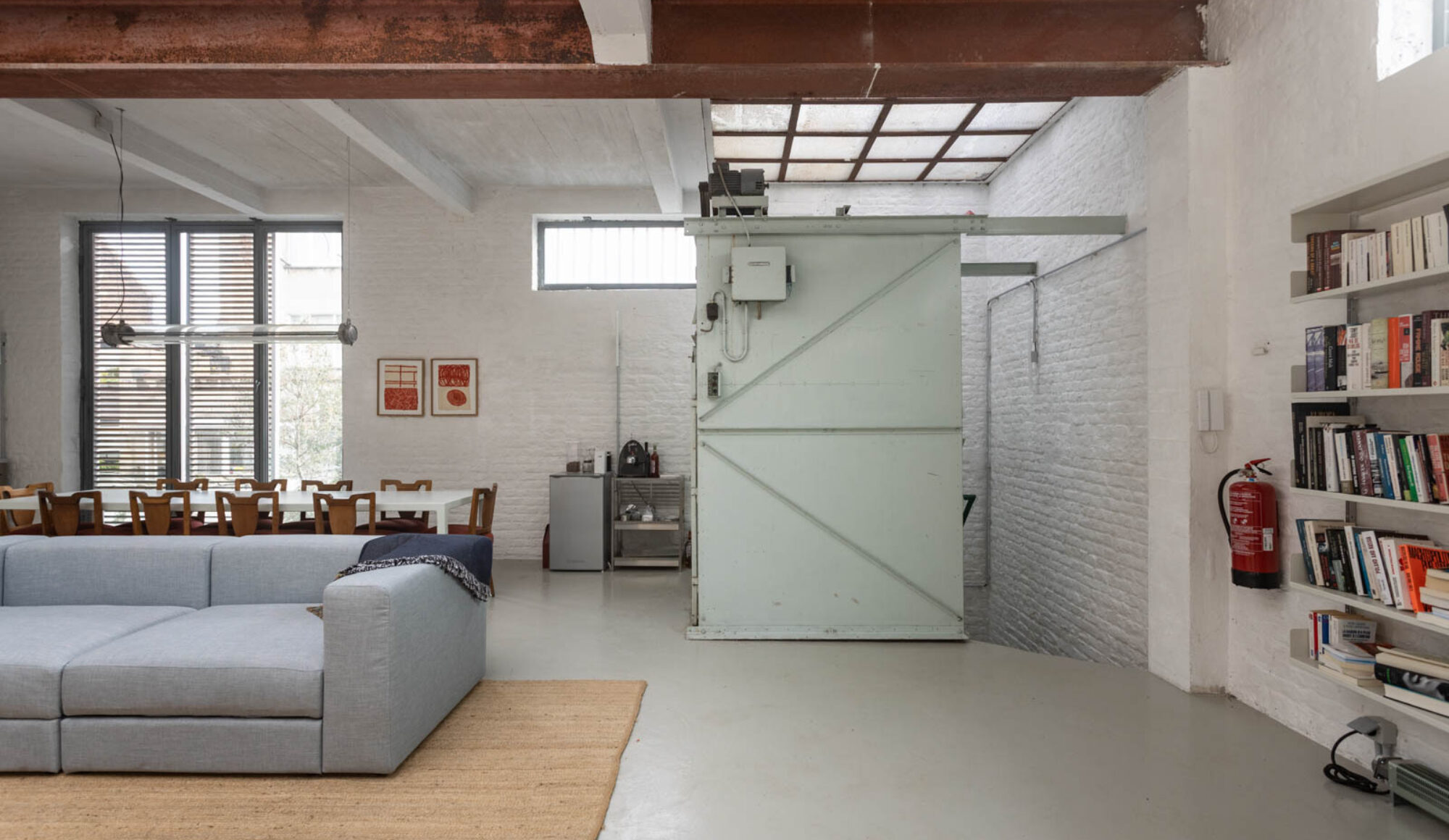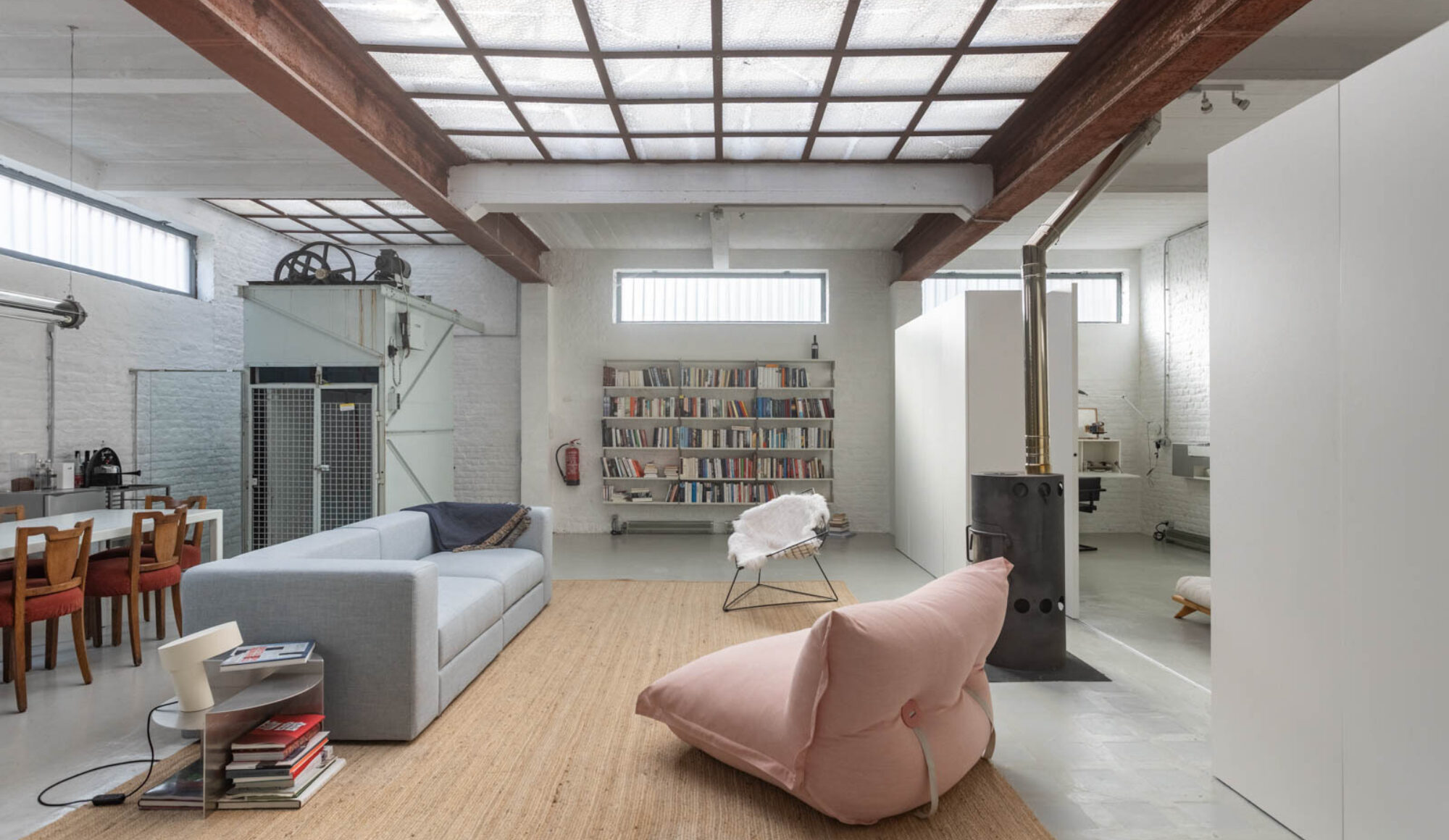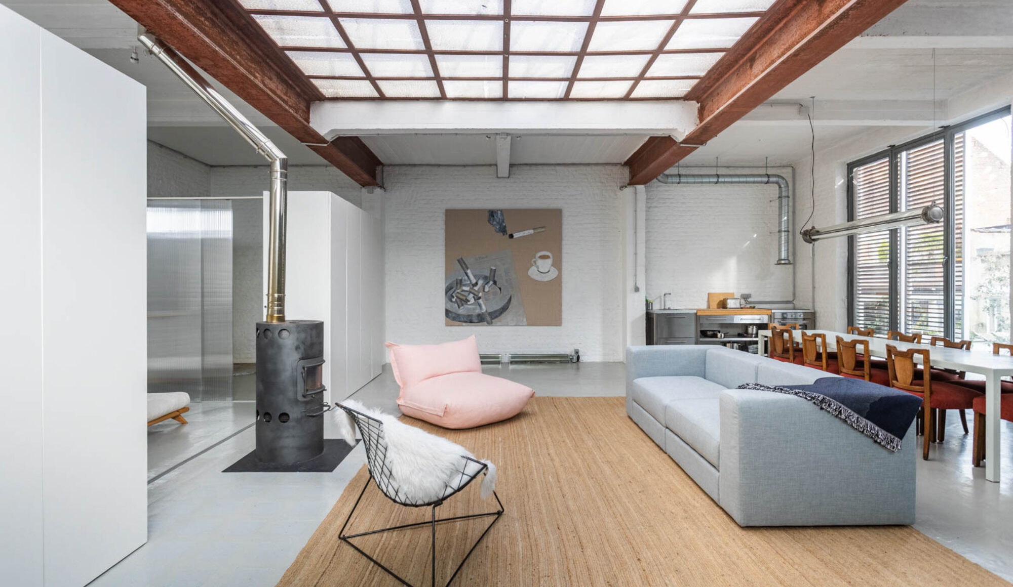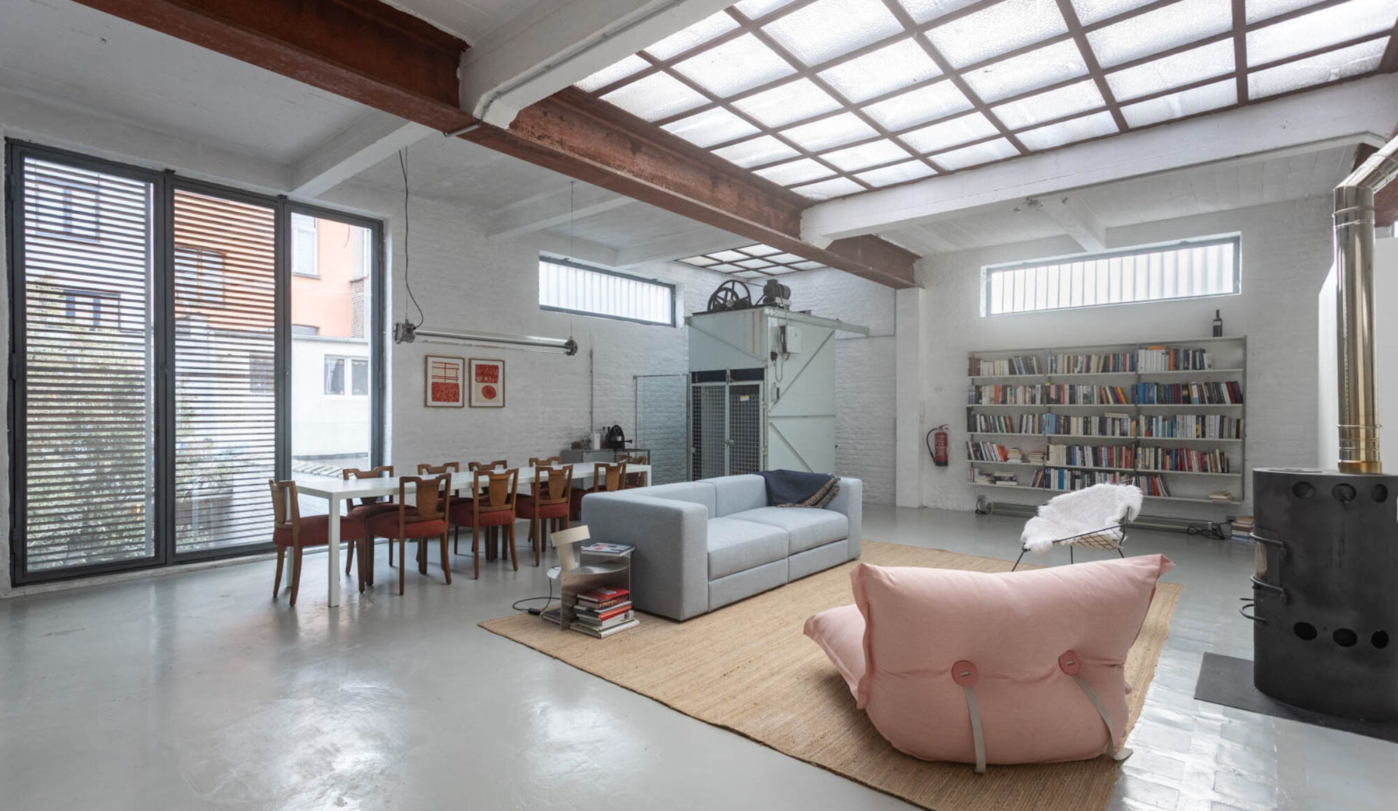 Le rez-de-chaussée s’ouvre via une robuste porte accordéon en acier, donnant accès à un espace flexible. Aujourd’hui utilisé comme atelier et espace de rangement, ce volume offre également un fort potentiel de réinterprétation créative, allant de l’atelier à l’espace d’exposition. Le contexte industriel reste palpable dans la structure porteuse apparente, le sol en béton et la matérialité brute. Ce lieu ne cherche pas à se cacher, mais puise au contraire son caractère dans son passé. L’étage supérieur, accessible via un ancien monte-charge au charme brut, a été aménagé en loft à plan ouvert. Un poêle à bois central divise subtilement l’espace en un coin salon, une zone de travail et un espace nuit. Derrière une paroi semi-transparente se trouve la salle de bains, qui conserve le caractère ouvert tout en instaurant une certaine intimité.