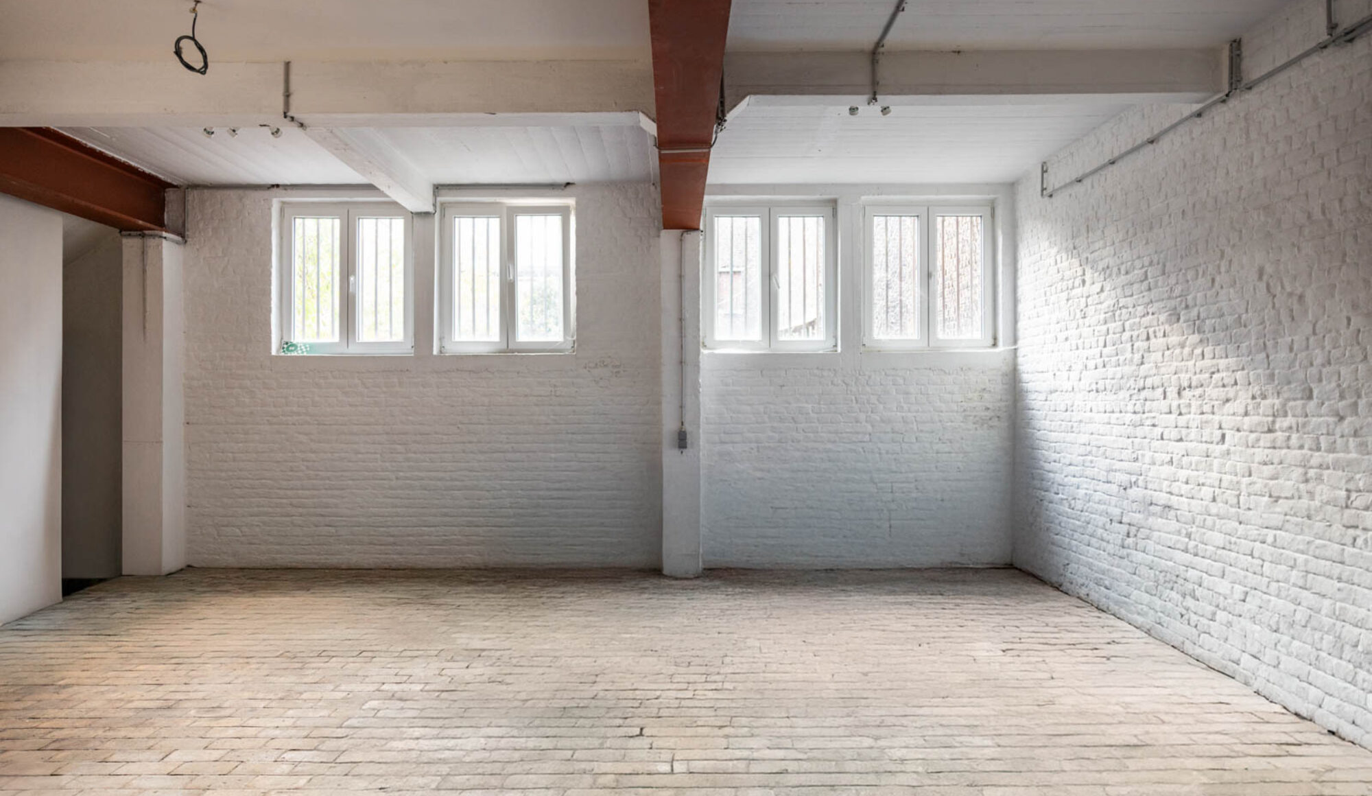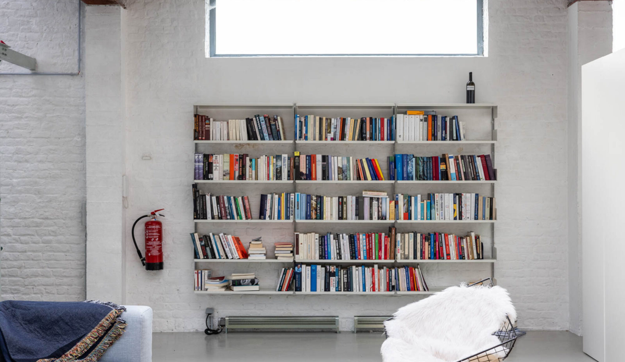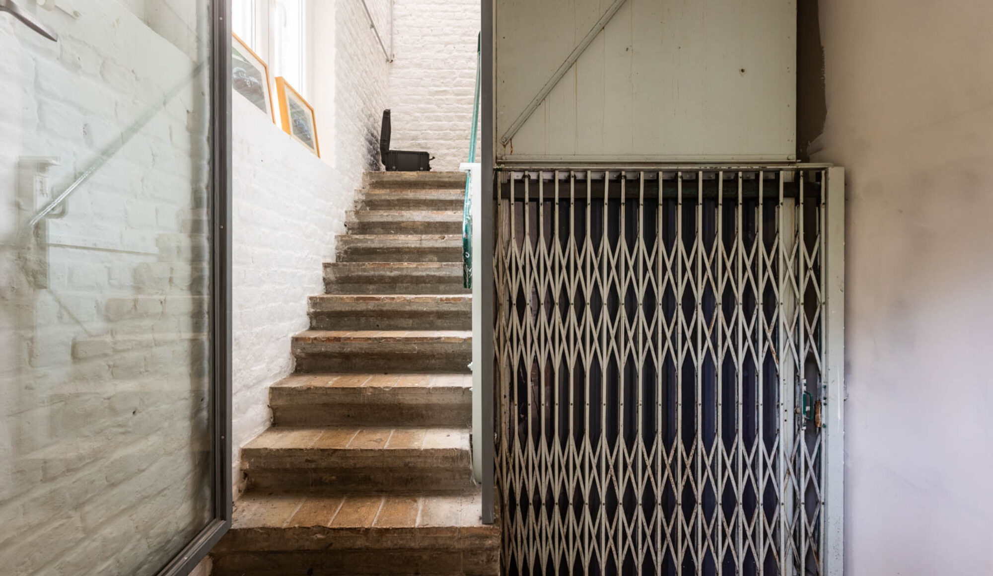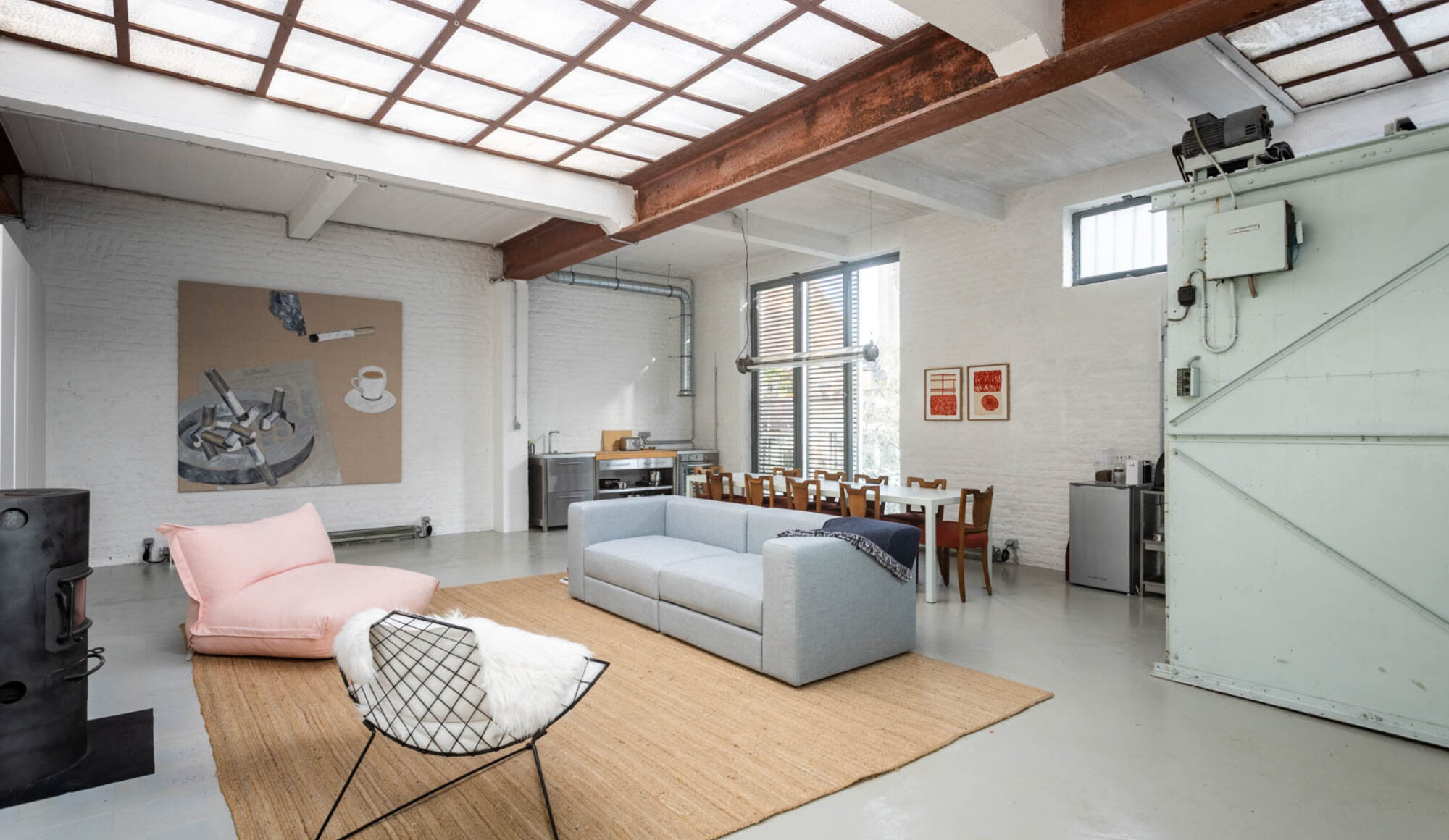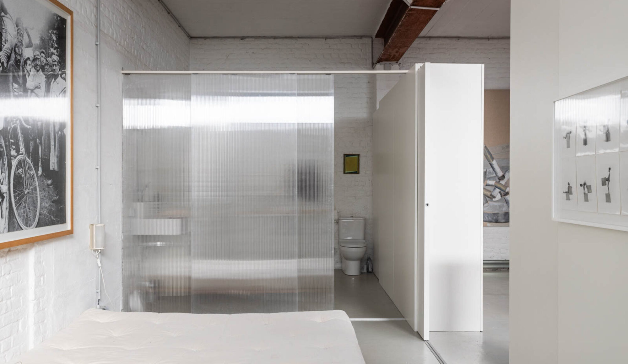 Le rez-de-chaussée s’ouvre via une robuste porte accordéon en acier, donnant accès à un espace flexible. Aujourd’hui utilisé comme atelier et espace de rangement, ce volume offre également un fort potentiel de réinterprétation créative, allant de l’atelier à l’espace d’exposition. Le contexte industriel reste palpable dans la structure porteuse apparente, le sol en béton et la matérialité brute. Ce lieu ne cherche pas à se cacher, mais puise au contraire son caractère dans son passé. L’étage supérieur, accessible via un ancien monte-charge au charme brut, a été aménagé en loft à plan ouvert. Un poêle à bois central divise subtilement l’espace en un coin salon, une zone de travail et un espace nuit. Derrière une paroi semi-transparente se trouve la salle de bains, qui conserve le caractère ouvert tout en instaurant une certaine intimité.