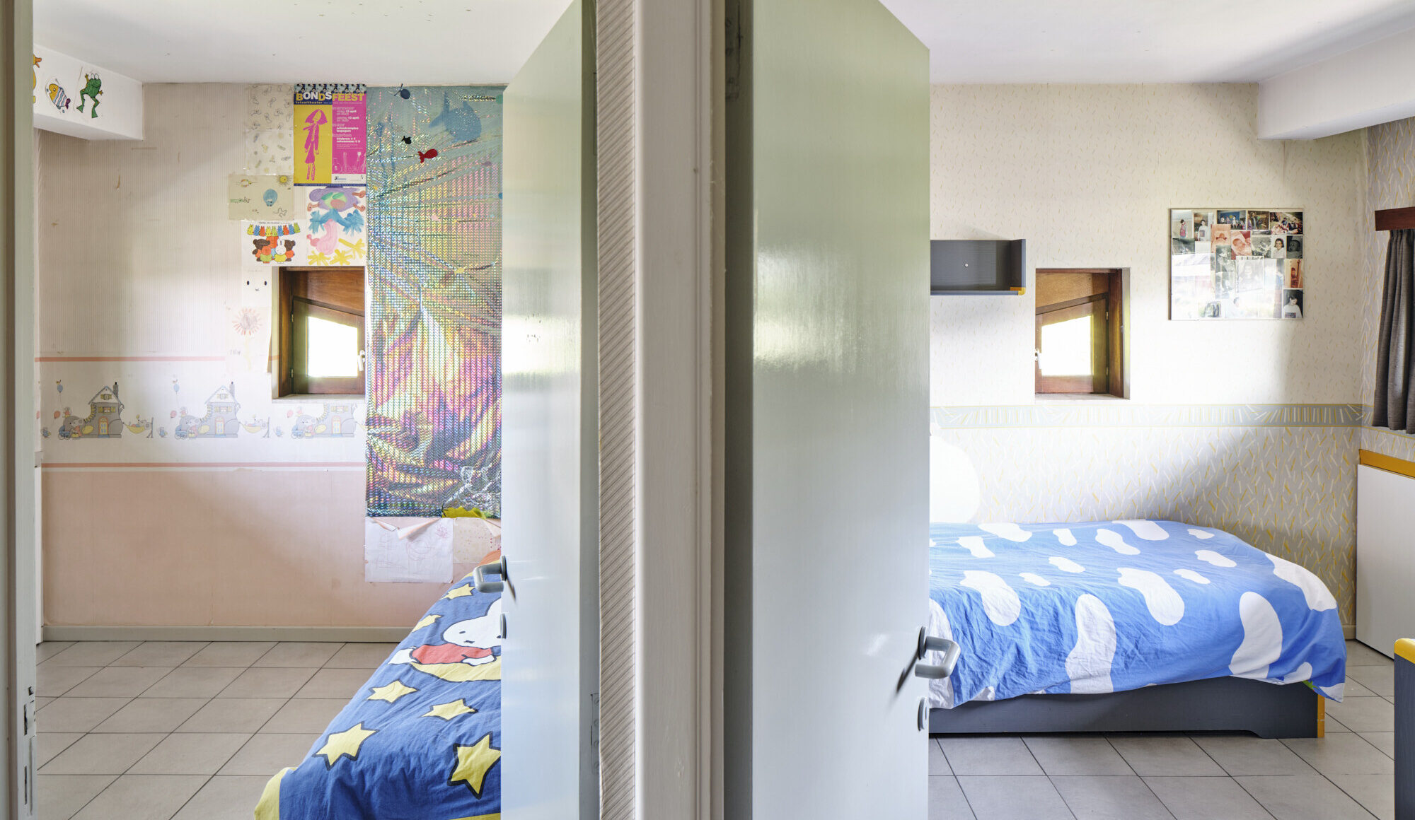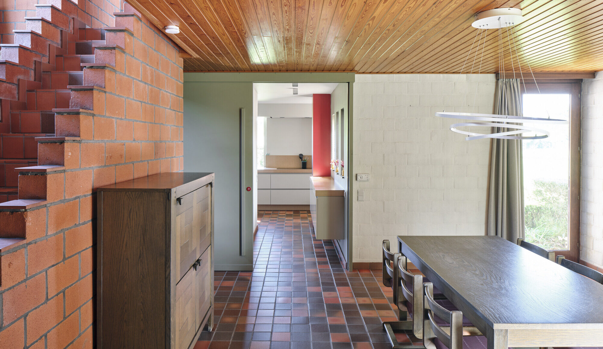 Au pied des douces collines des Ardennes flamandes, nichée dans le quartier verdoyant de Wolvenberg à Mater (Audenaerde), se trouve cette maison de caractère conçue par l’architecte Luc De Vriendt. Construite en 1981, elle incarne une vision affirmée de l’habitat où simplicité, lumière et structure s’harmonisent naturellement. L’architecte s’est clairement inspiré de l’œuvre de Juliaan Lampens, et plus particulièrement de la Maison Diane Lampens. Cela se reflète non seulement dans les matériaux et les volumes, mais surtout dans la structure marquante de la toiture : un jeu géométrique de pans inclinés qui donne rythme et direction aux espaces intérieurs tout en répondant subtilement à la lumière naturelle. Ici, le toit ne couvre pas simplement : il structure et définit.