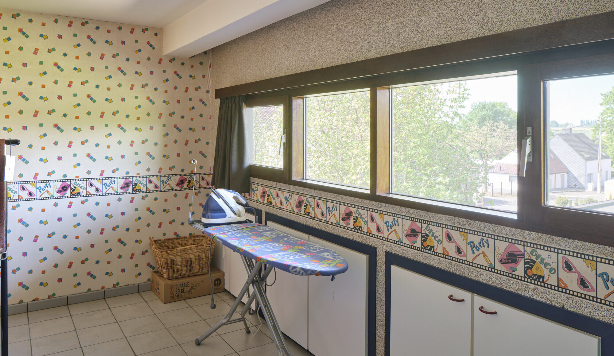 Avec une surface habitable de 243 m² sur un terrain de plus de 1.600 m², la maison offre un cadre de vie spacieux. À l’étage, on trouve quatre vraies chambres, une salle de bains, ainsi qu’un espace de rangement équipé de raccordements pour une seconde salle de bains (eau chaude et froide, évacuation), bien que celui-ci n’ait jamais été utilisé à cette fin. Entre l’étage de vie et le niveau supérieur, un demi-niveau est aménagé en bureau – un lieu parfait pour le télétravail ou une activité créative, avec une vue à la fois intime et dégagée.