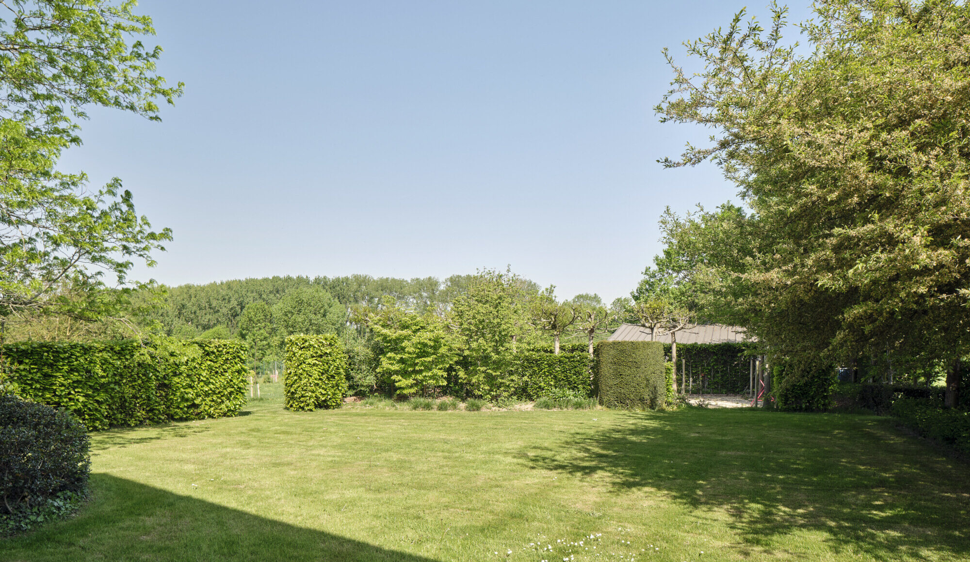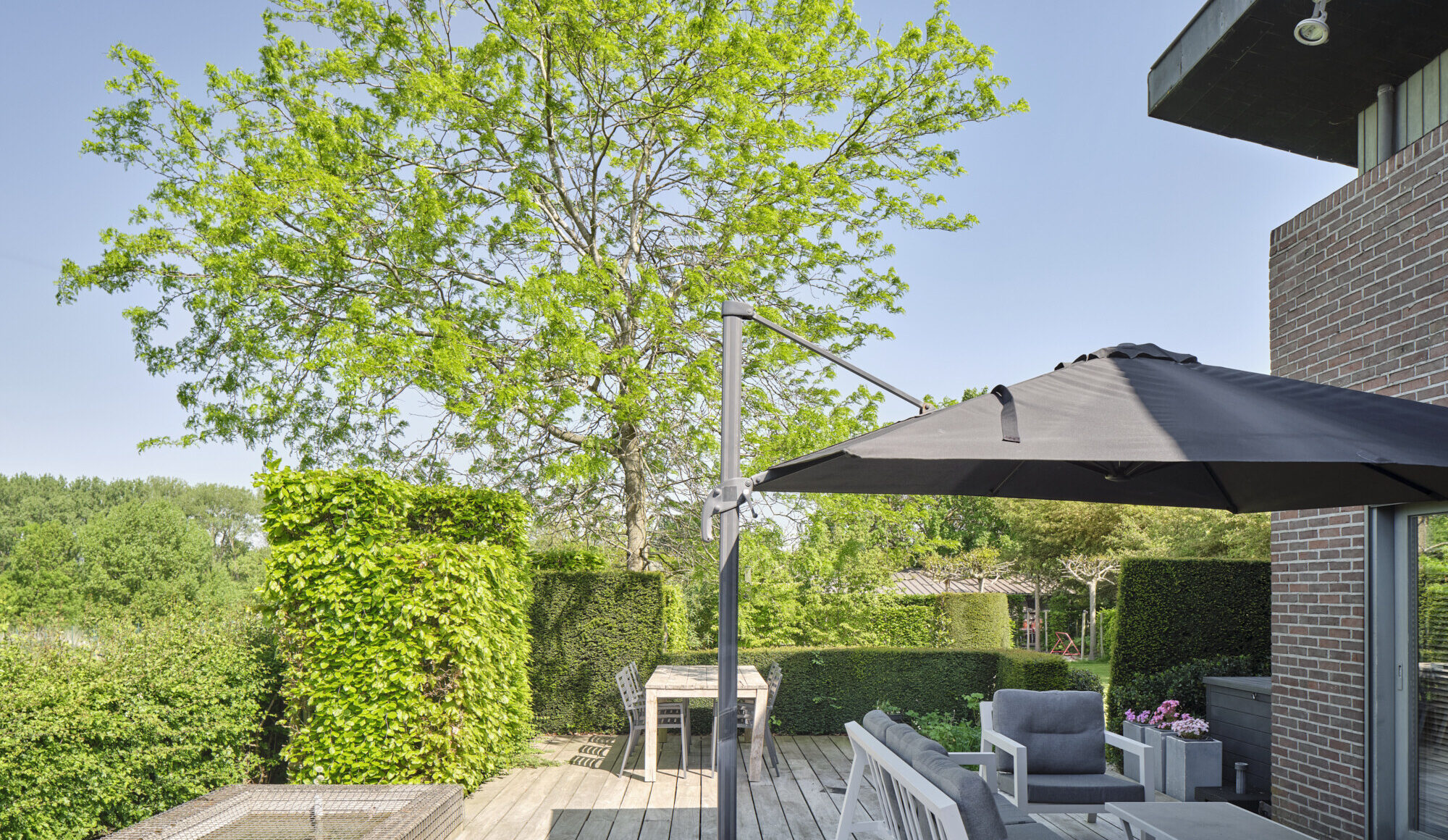 Le jardin n’est pas un simple décor, mais une extension cohérente de l’architecture. Terrasses, haies et pelouses se succèdent en un jeu subtil de vues et d’intimité. La grande terrasse en bois invite à profiter des longues soirées à l’ombre des arbres. Malgré son orientation nord, la configuration ouverte du terrain permet à la lumière naturelle de baigner l’ensemble en douceur.