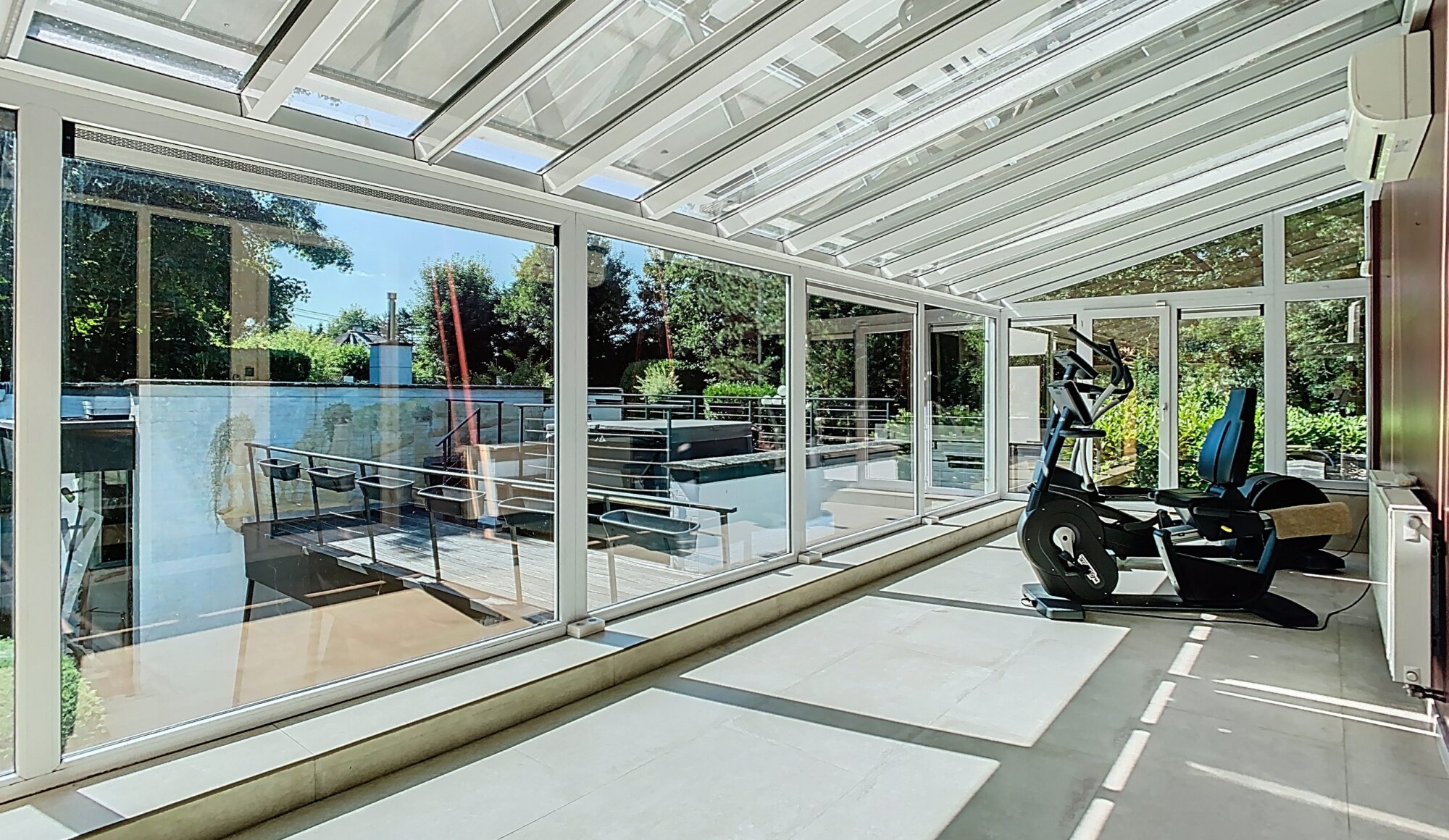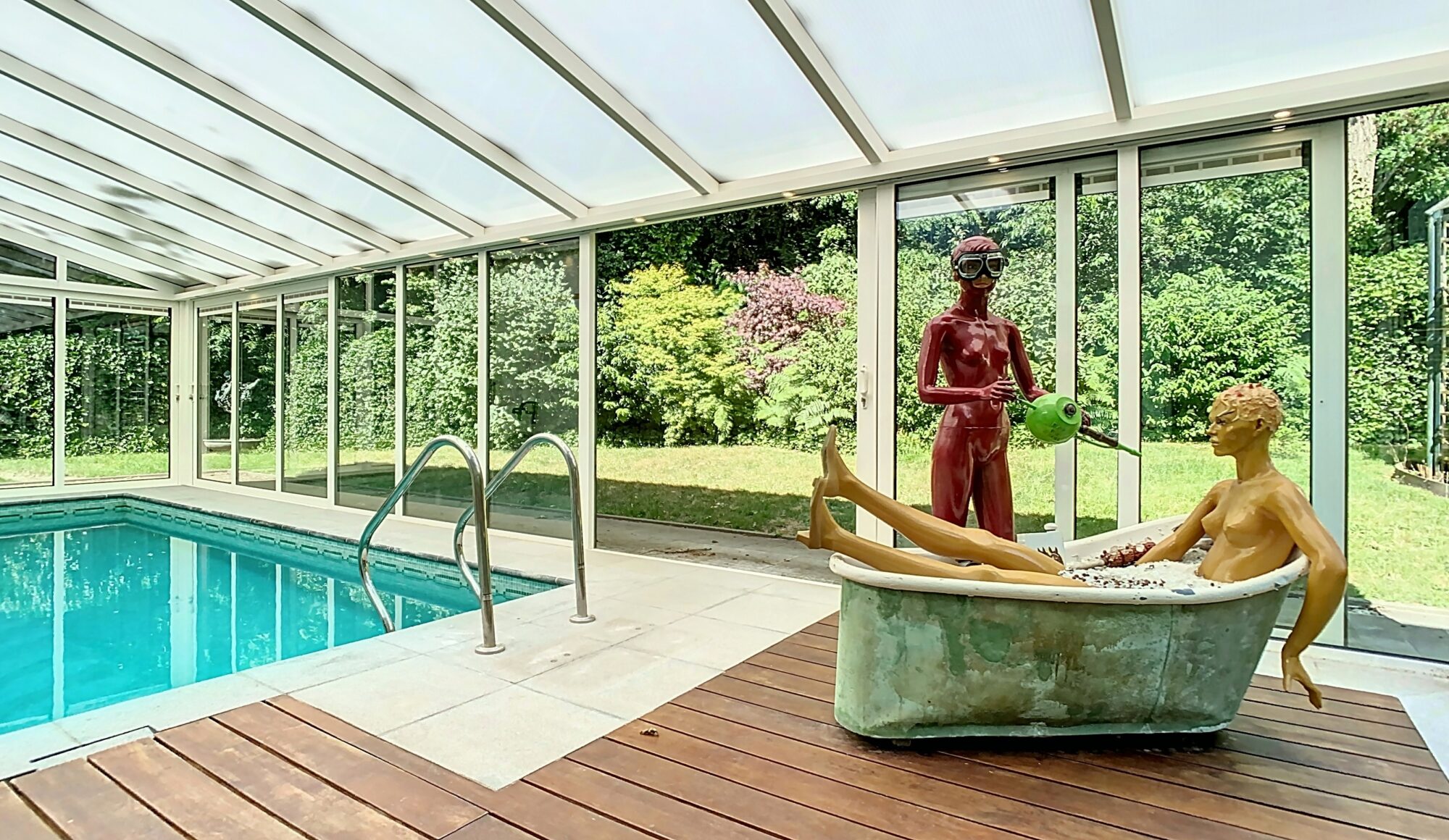 Une entrée indépendante mène à une aile professionnelle parfaitement intégrée, autrefois conçue pour une profession libérale. Loin d’être un simple ajout fonctionnel, cet espace s’inscrit naturellement dans la composition générale. De même, la zone bien-être — piscine intérieure, sauna, jacuzzi — s’intègre avec justesse dans le langage architectural du lieu, sans jamais rompre l’unité de l’ensemble.