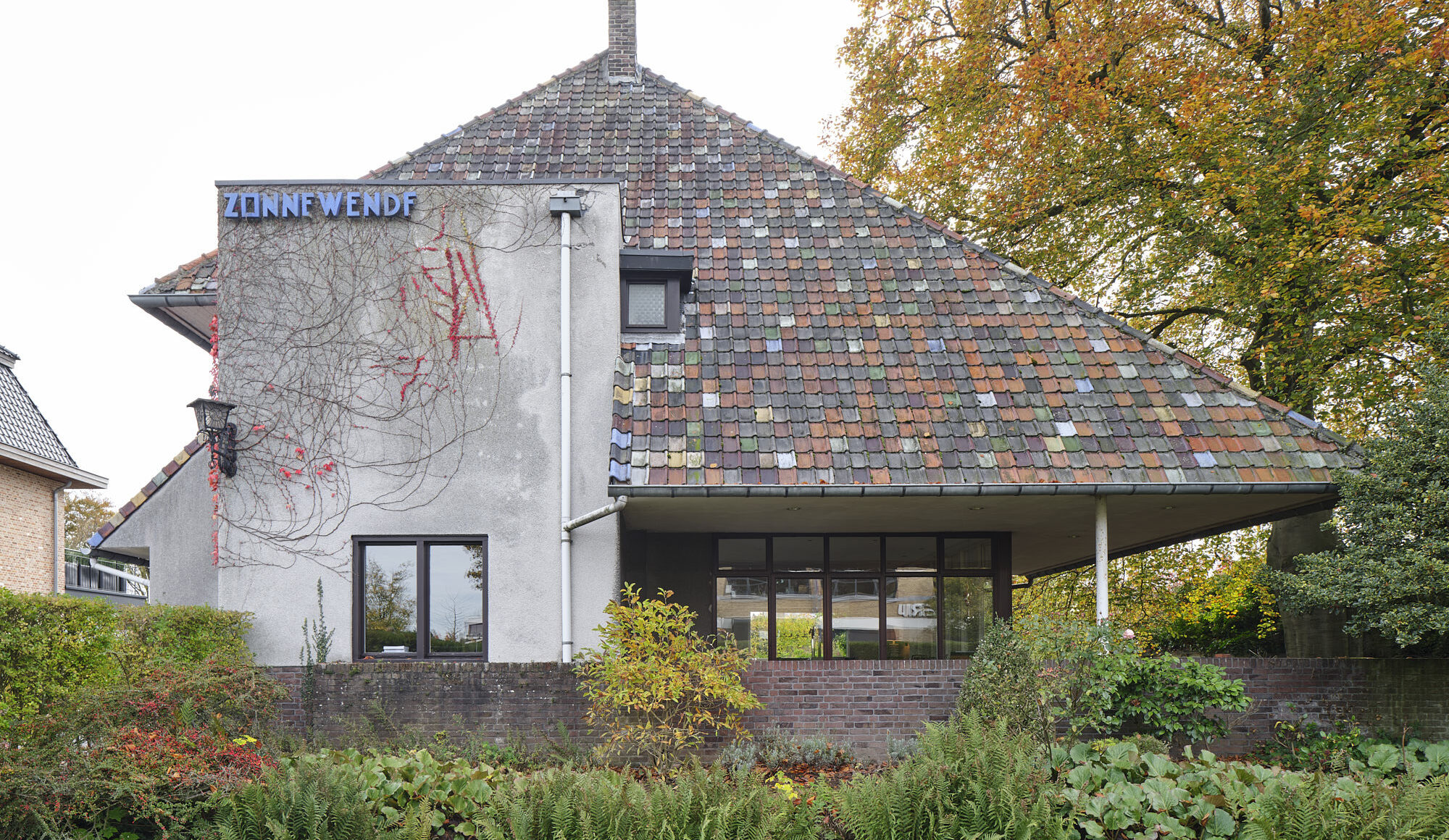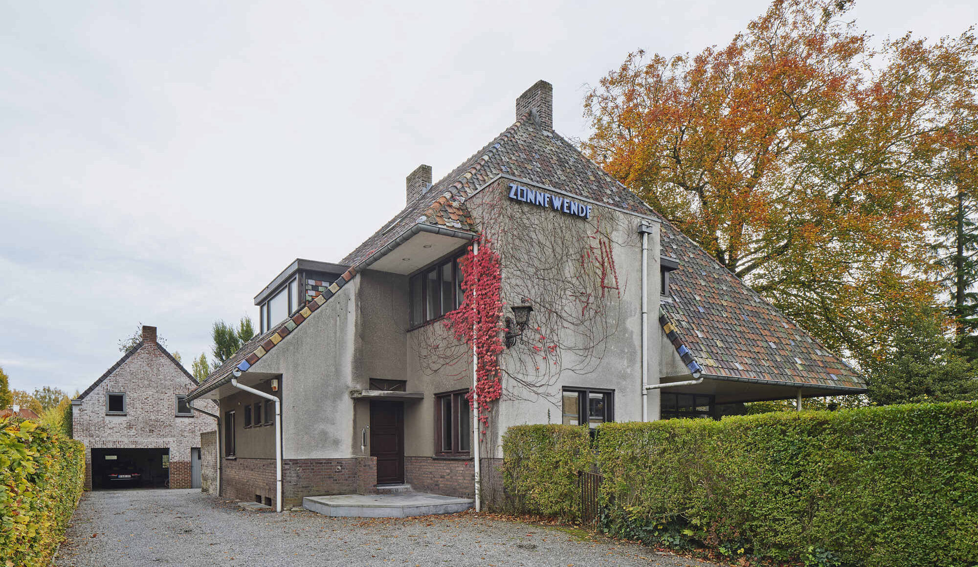 L’influence de Jos Wielders, pionnier du modernisme dans les Pays‑Bas et en Belgique, se fait sentir jusque dans le moindre détail. Sa préférence pour la fonctionnalité sans ornement, pour la lumière et l’espace plutôt que pour la décoration, s’exprime de manière exemplaire dans la villa « Zonnewende ». Le bâtiment est érigé en briques cimentées, surmonté d’un toit‑terrasse bas qui se déploie comme une cape protectrice au‑dessus de l’ensemble. Les façades épurées, le rythme des ouvertures rectangulaires, les volumes décalés et modulés – tout ici est conçu dans un esprit d’évidence, de clarté et d’habitabilité. Le toit en surplomb, la fenêtre‑angle sur deux façades, l’oriel vertical qui vient rompre la composition : autant d’éléments à la fois fonctionnels et esthétiques.