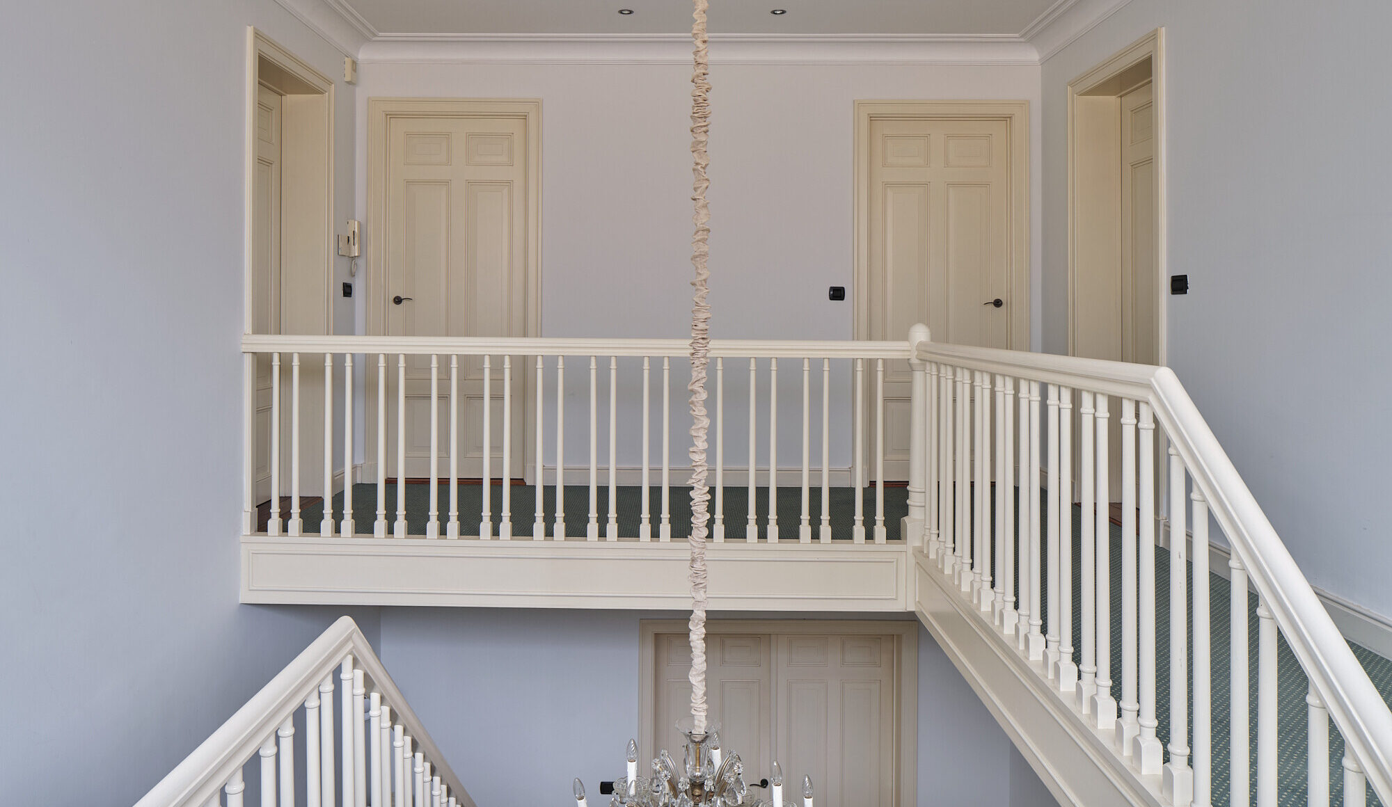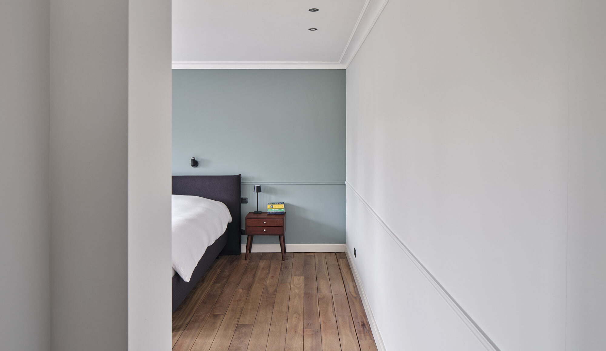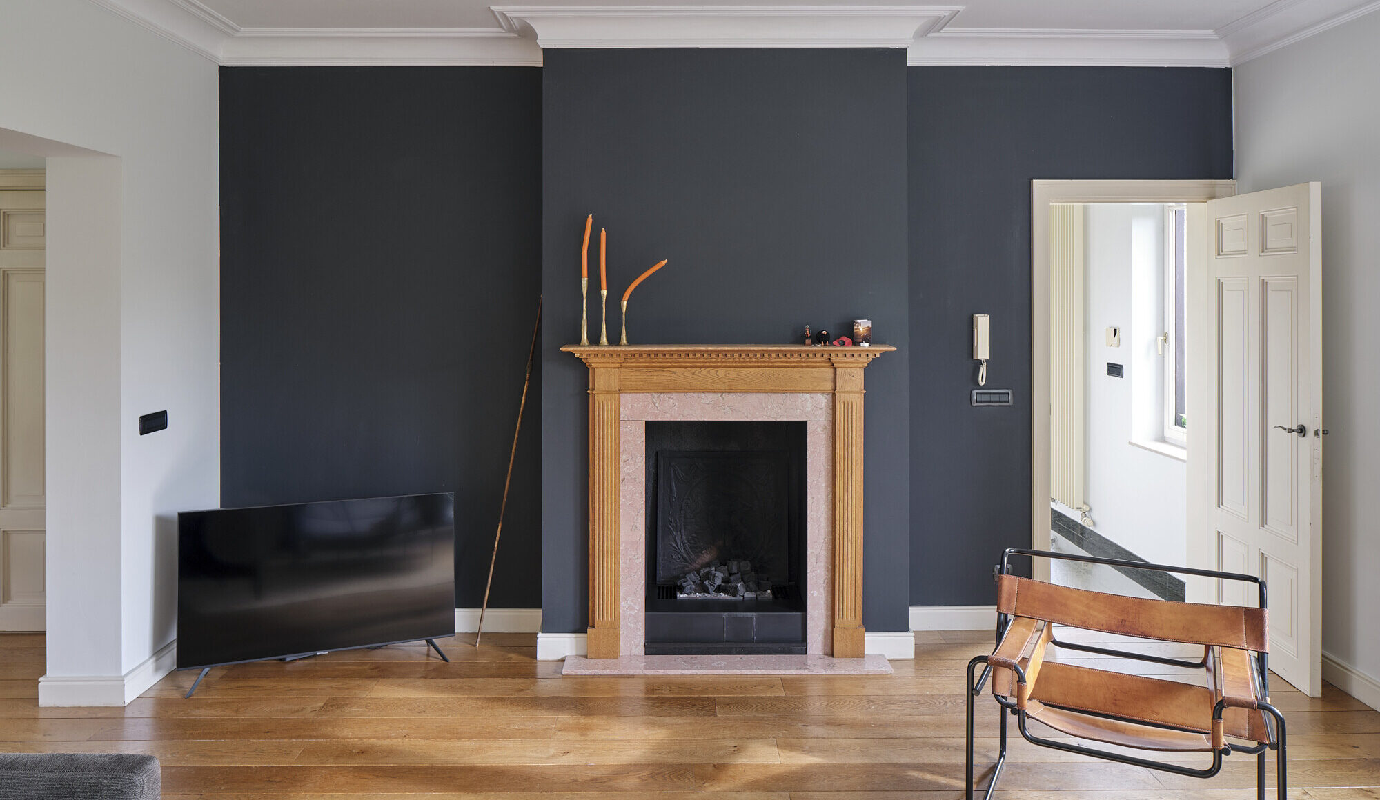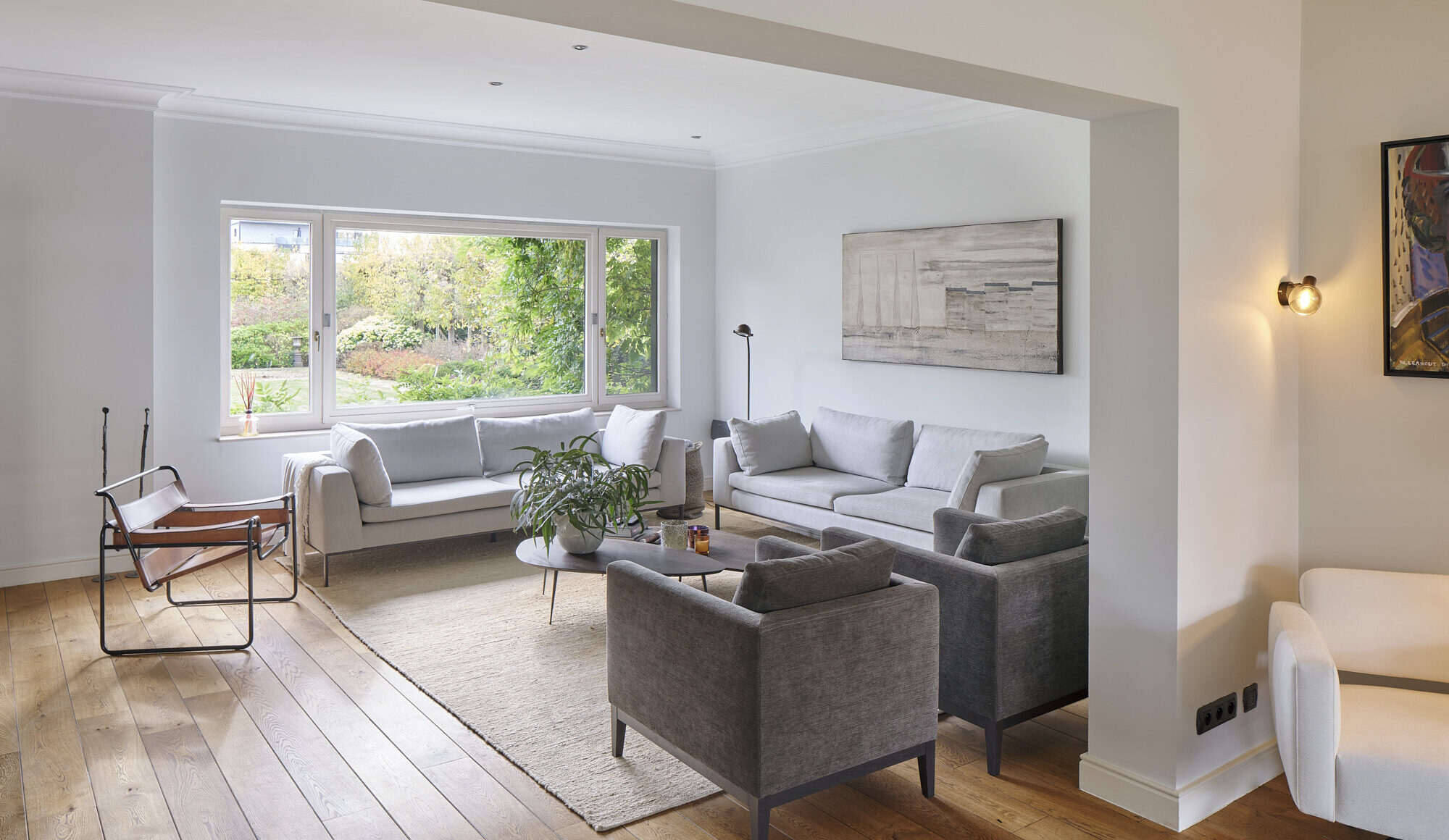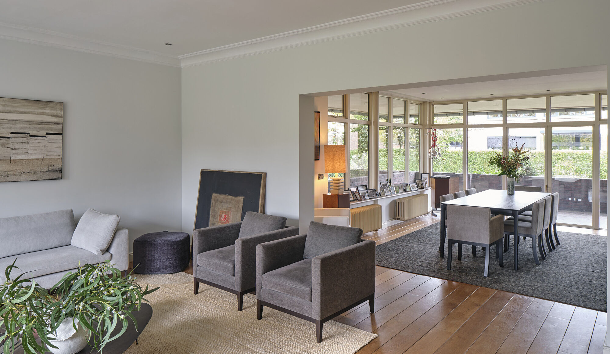En franchissant l’entrée de la villa, on pénètre un intérieur où l’architecture vous guide subtilement. Une vaste entrée avec sol en pierre naturelle et cage d’escalier statue forme le cœur de la maison. Depuis ce point central s’ouvrent les différents espaces de vie – chacun avec sa propre fonction, mais connectés par les matériaux et l’esprit. Le salon avec cheminée invite à la chaleur et à l’intimité, tandis que la salle à manger attenante s’ouvre généreusement sur le jardin. De larges baies vitrées invitent le vert environnant à l’intérieur, de sorte que l’intérieur et l’extérieur fusionnent harmonieusement. Parquets en bois d’origine, plafonds hauts et détails soigneusement conservés de l’époque confèrent une sensation d’élégance intemporelle.