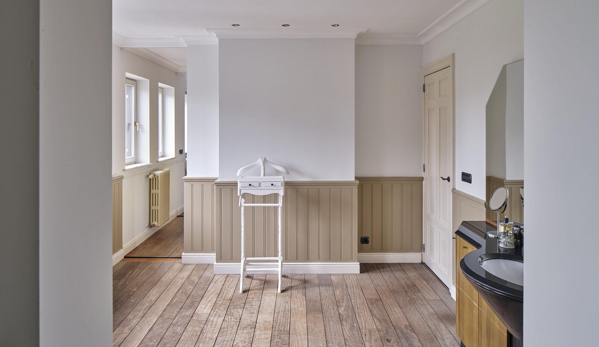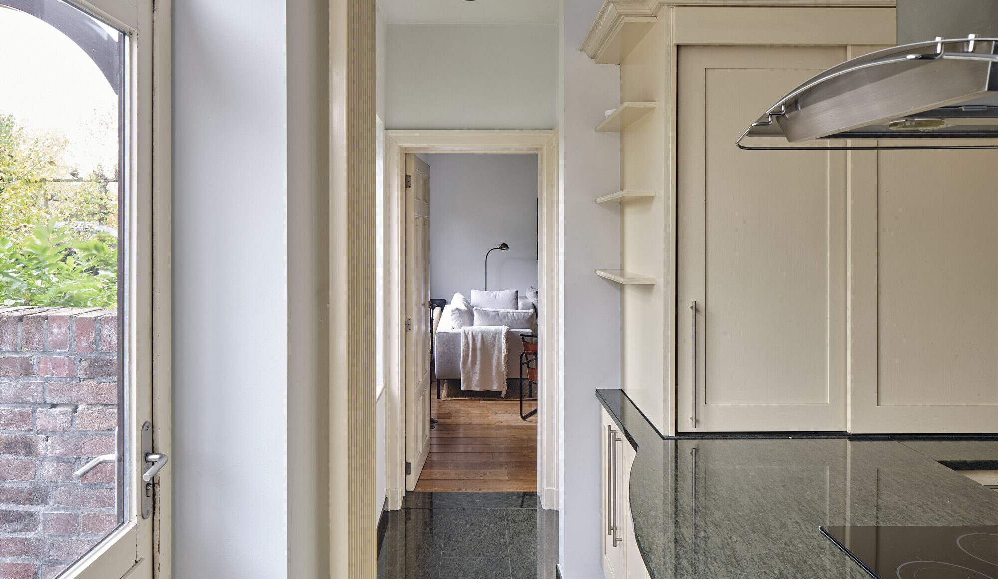 La cuisine a été aménagée avec un souci d’esthétique et d’ergonomie. Elle s’ouvre sur la terrasse et le jardin, et comporte un coin petit‑déjeuner qui évoque une ambiance détendue. On y ressent comment le confort moderne s’intègre sans effort dans une demeure chargée d’histoire. L’étage compte quatre chambres généreuses, offrant une vue sur le parc. La configuration laisse également la possibilité d’agrandir sans compromettre la logique architecturale du lieu.