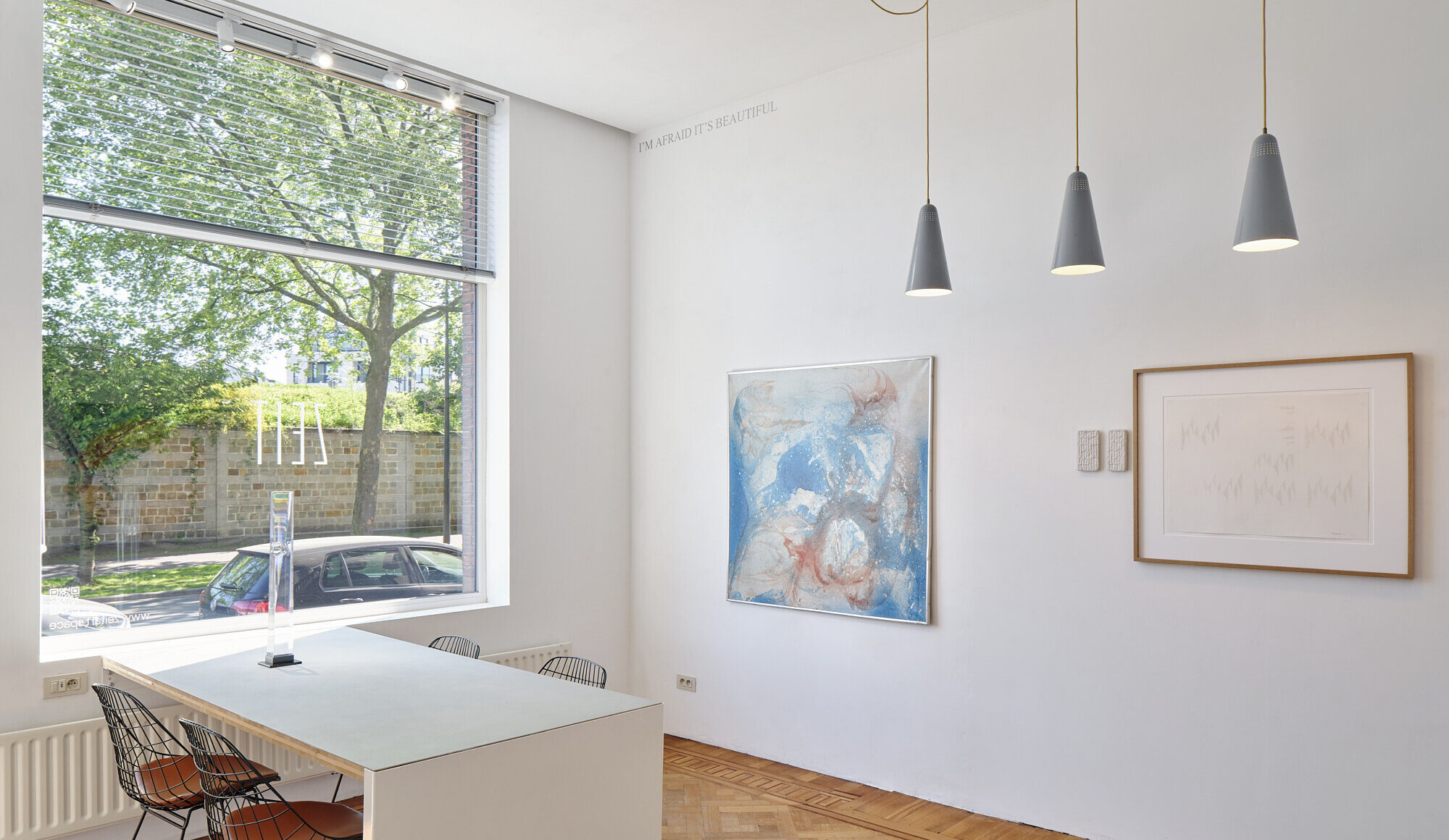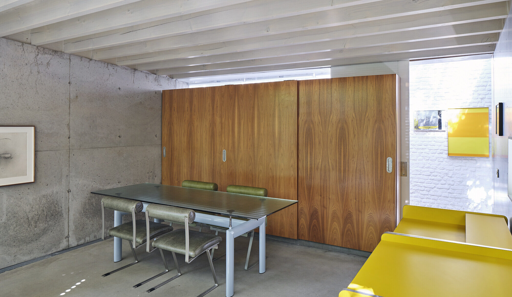 Les quatre espaces de l’ancien cabinet, du bord de la rue jusqu’au jardin, ont été transformés en galerie ZEIT : un lieu dédié à l’art moderne et contemporain, avec ses hauts plafonds et son parquet à l’avant, et son architecture en béton apparent, ses vitrages généreux et ses volumes clairs et modulables dans le pavillon arrière. Elle constitue le cœur vibrant de la maison, tout en pouvant servir de studio, bureau, salle de réception ou atelier.