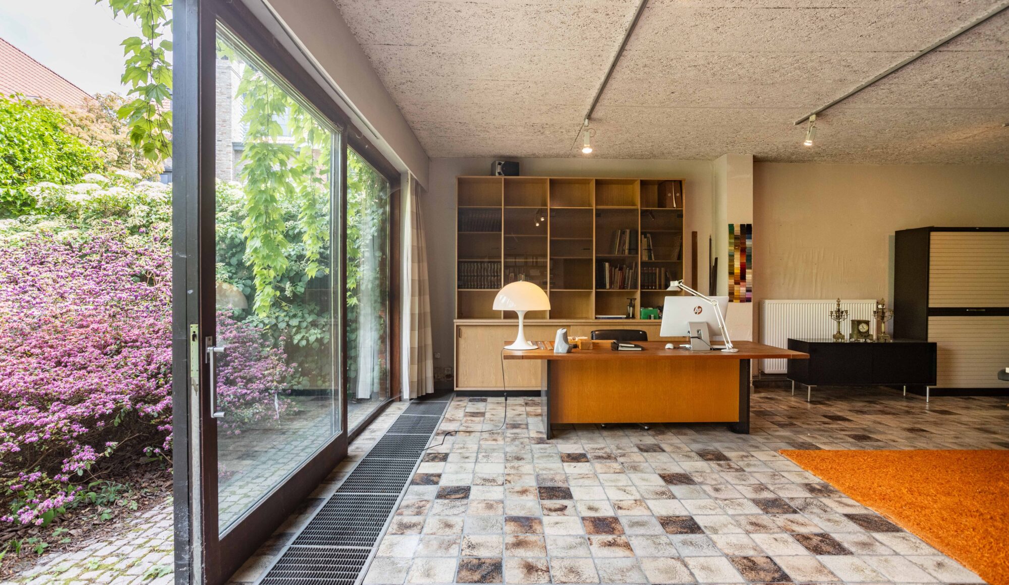 Een uitgestrekt atelier met uitzicht op aangelegde tuin