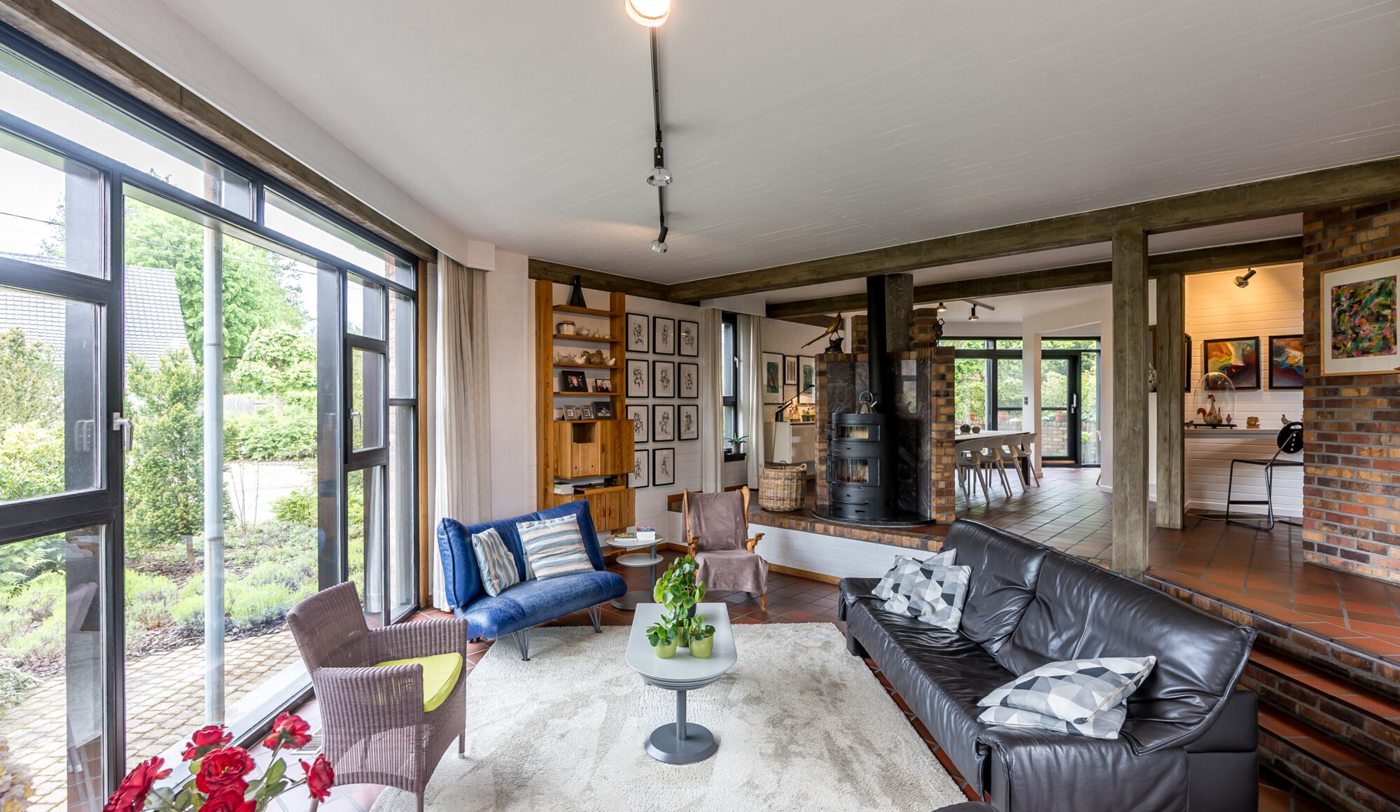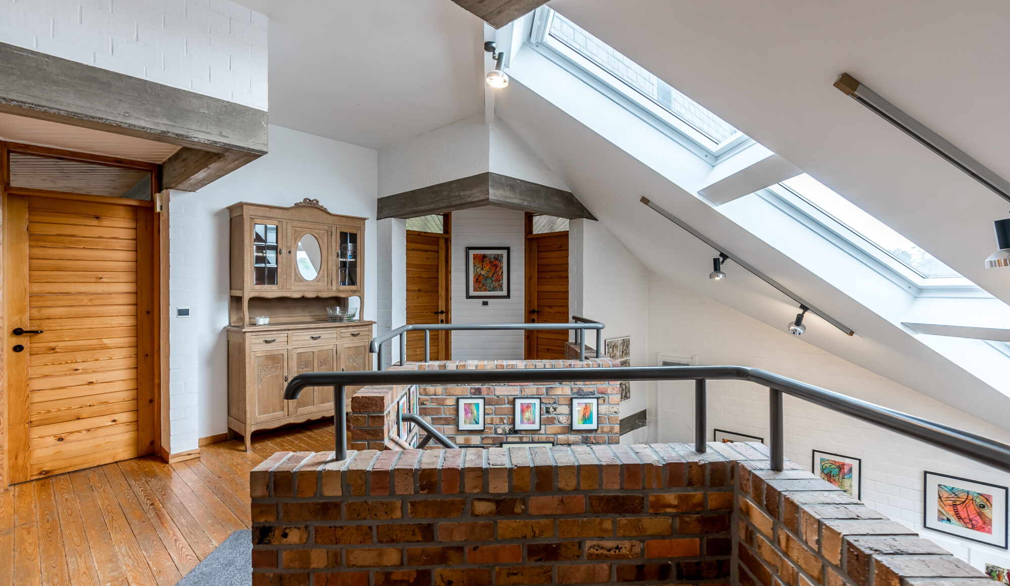 Vanuit de inkomhal met gastentoilet betreed je een royale leefruimte die zich opent naar de tuin via grote raampartijen. Licht stroomt overvloedig binnen en zet elke ruimte in beweging, terwijl het uitzicht op de volgroeide tuin voor een rustgevende sfeer zorgt. De open eetruimte vloeit elegant over in de keuken, met daarnaast een salon en een gezellige relaxhoek – elk met hun eigen karakter en functie.