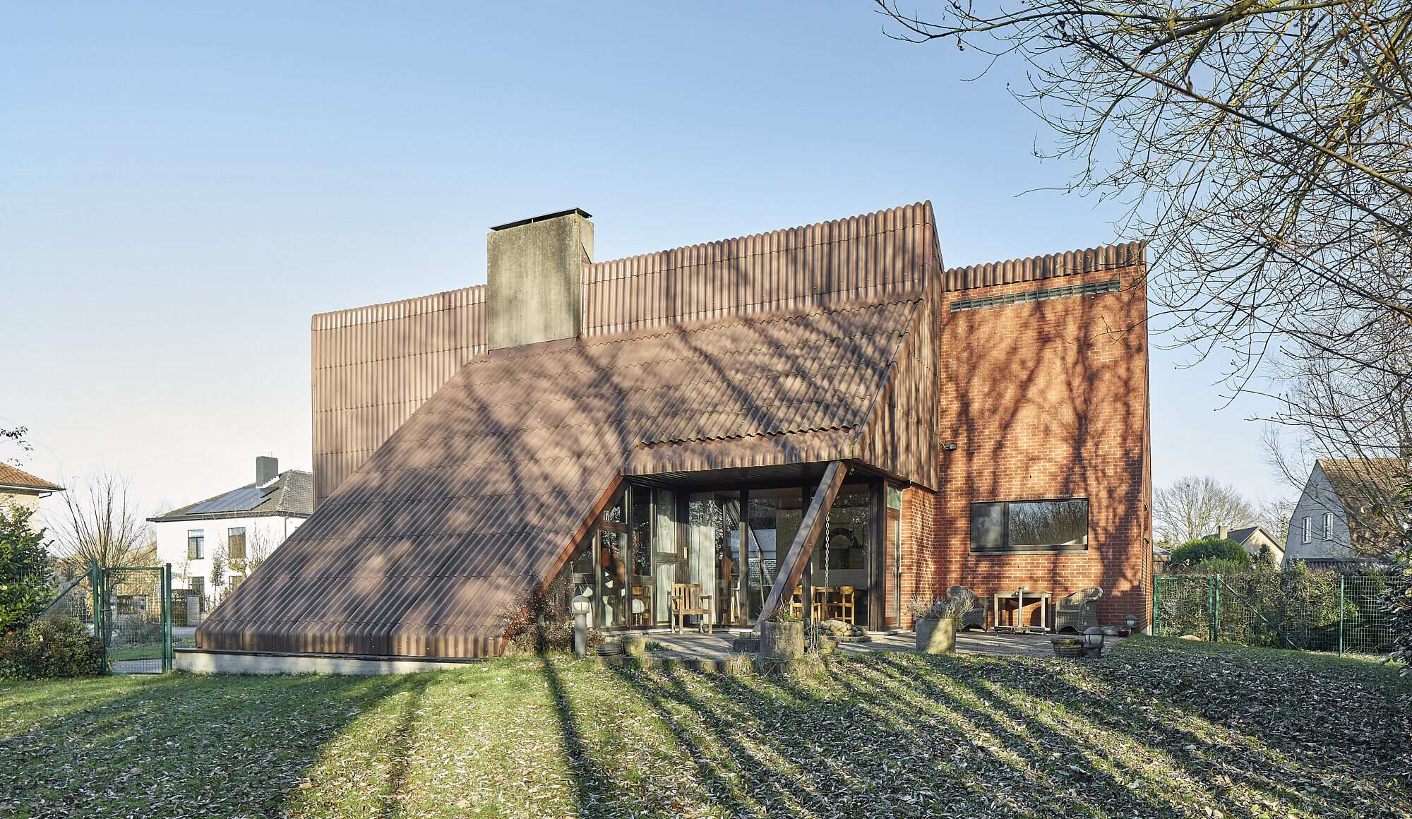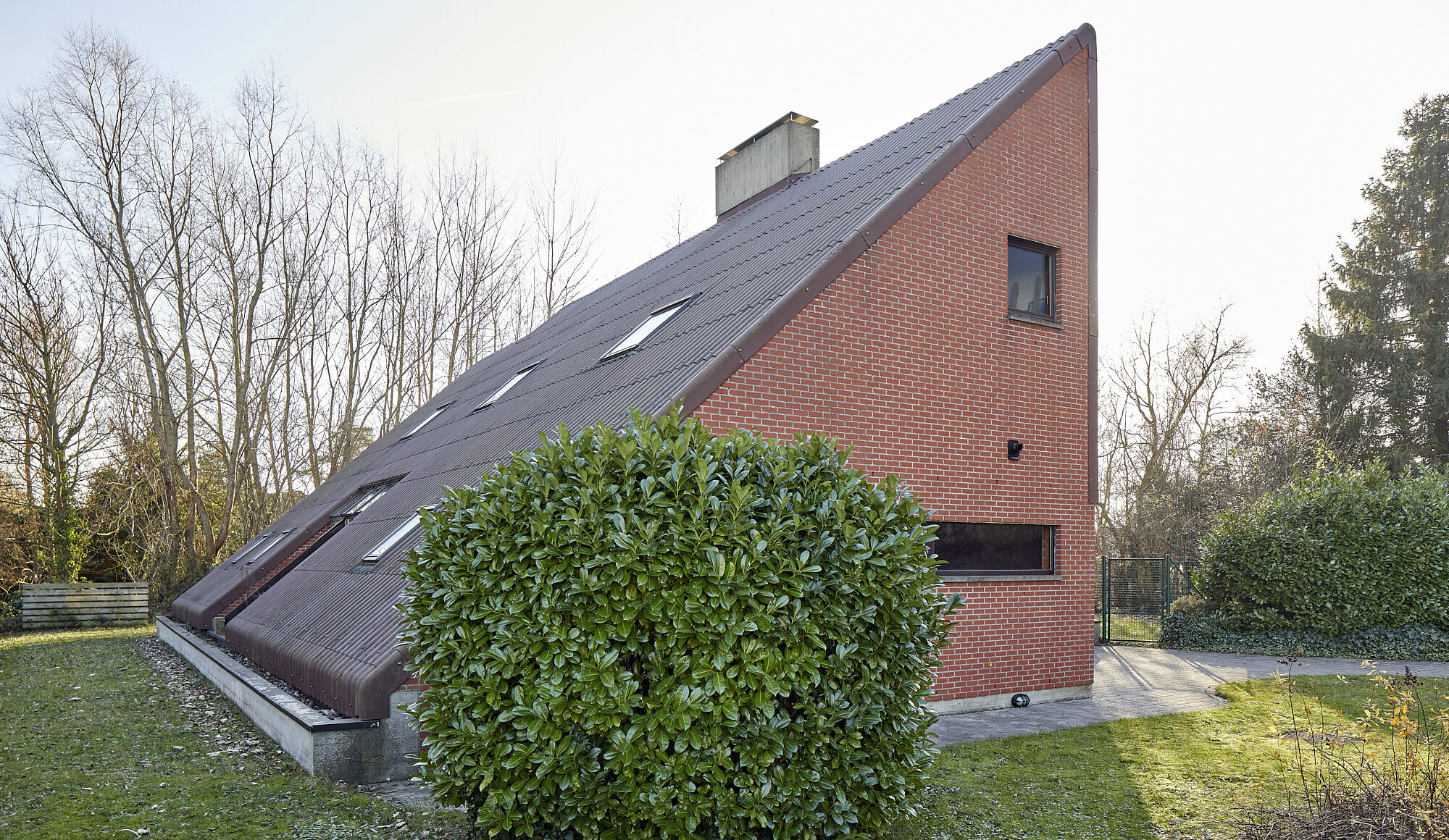 De vormgeving is geometrisch uitgezet in grote asymmetrische rechte en schuine vlakken in een fascinerende mix van rode baksteen en betonplaten (niet asbesthoudend). De doordachte dakconstructie is zowel esthetisch top als functioneel naar indeling toe van de volumes en maximalisatie van binnenruimtes.