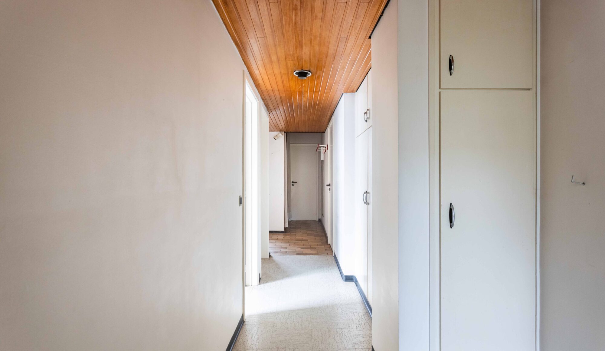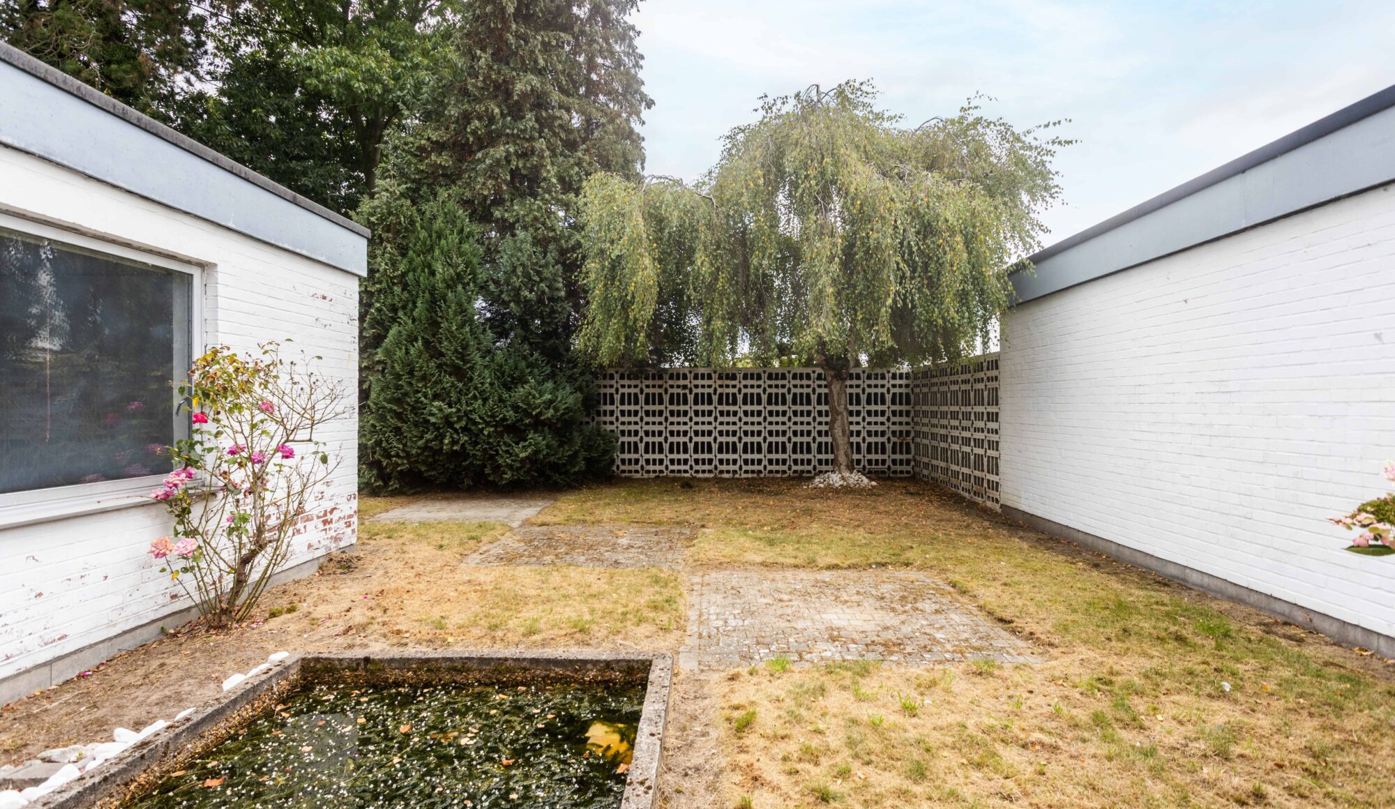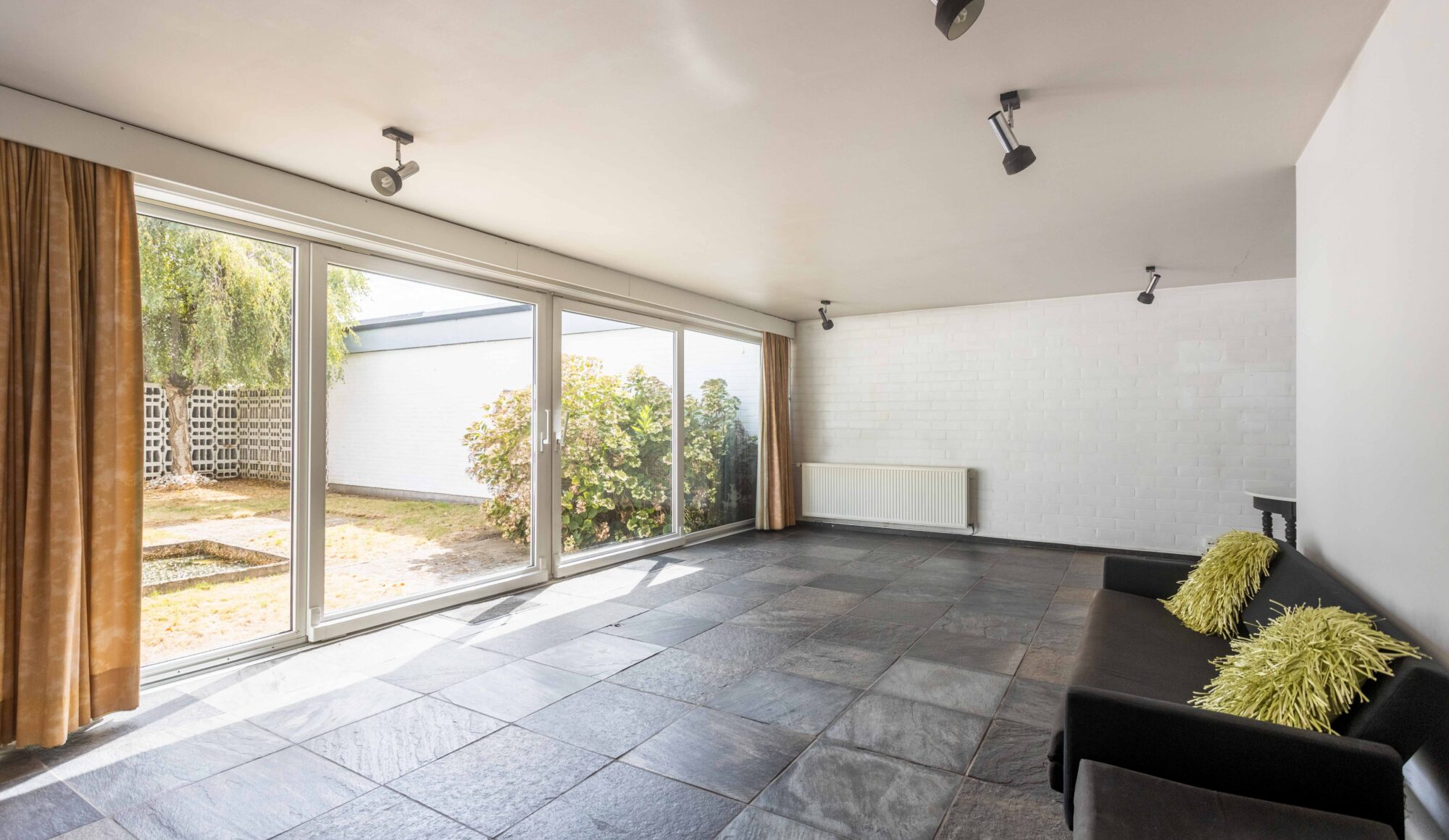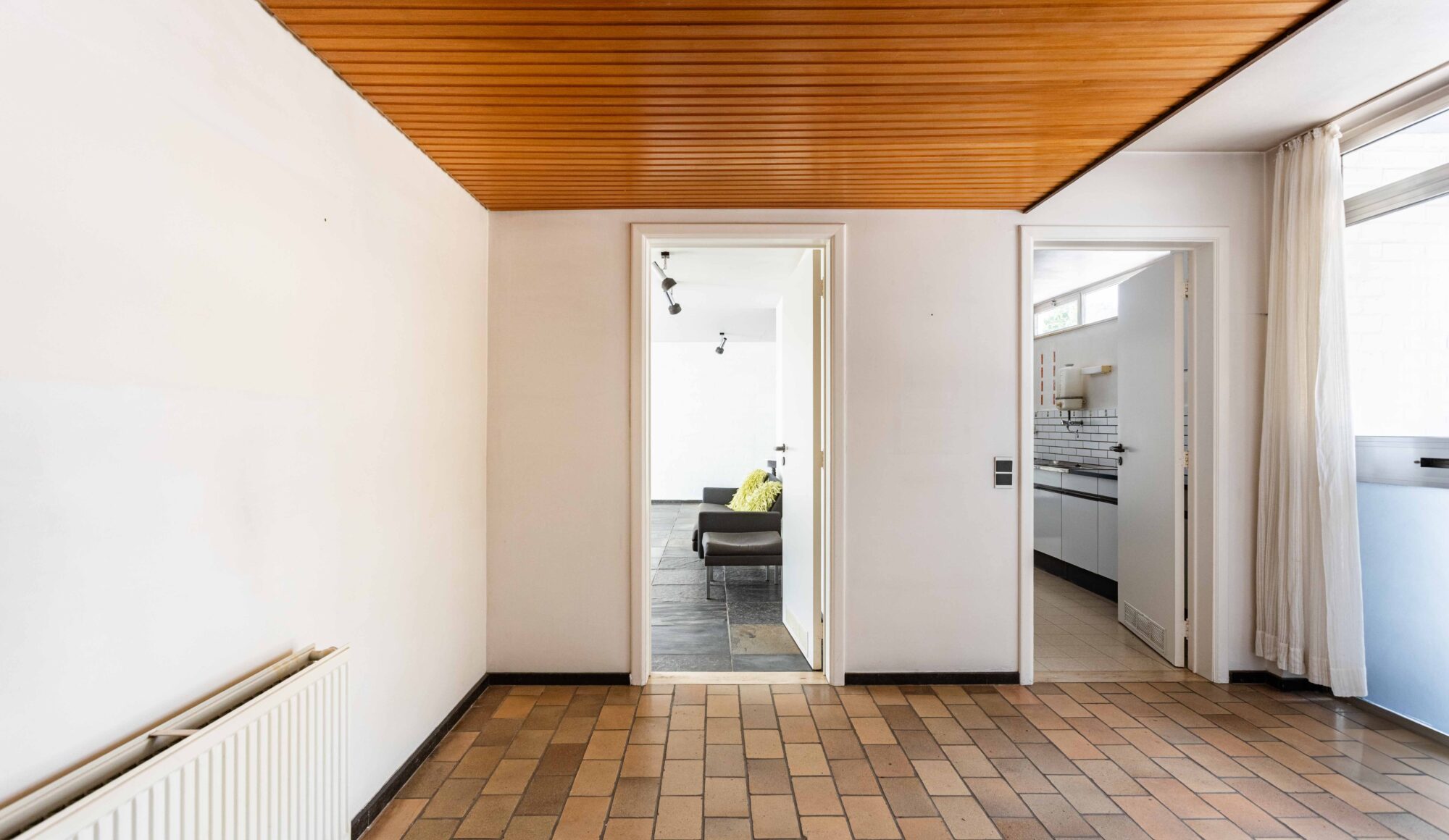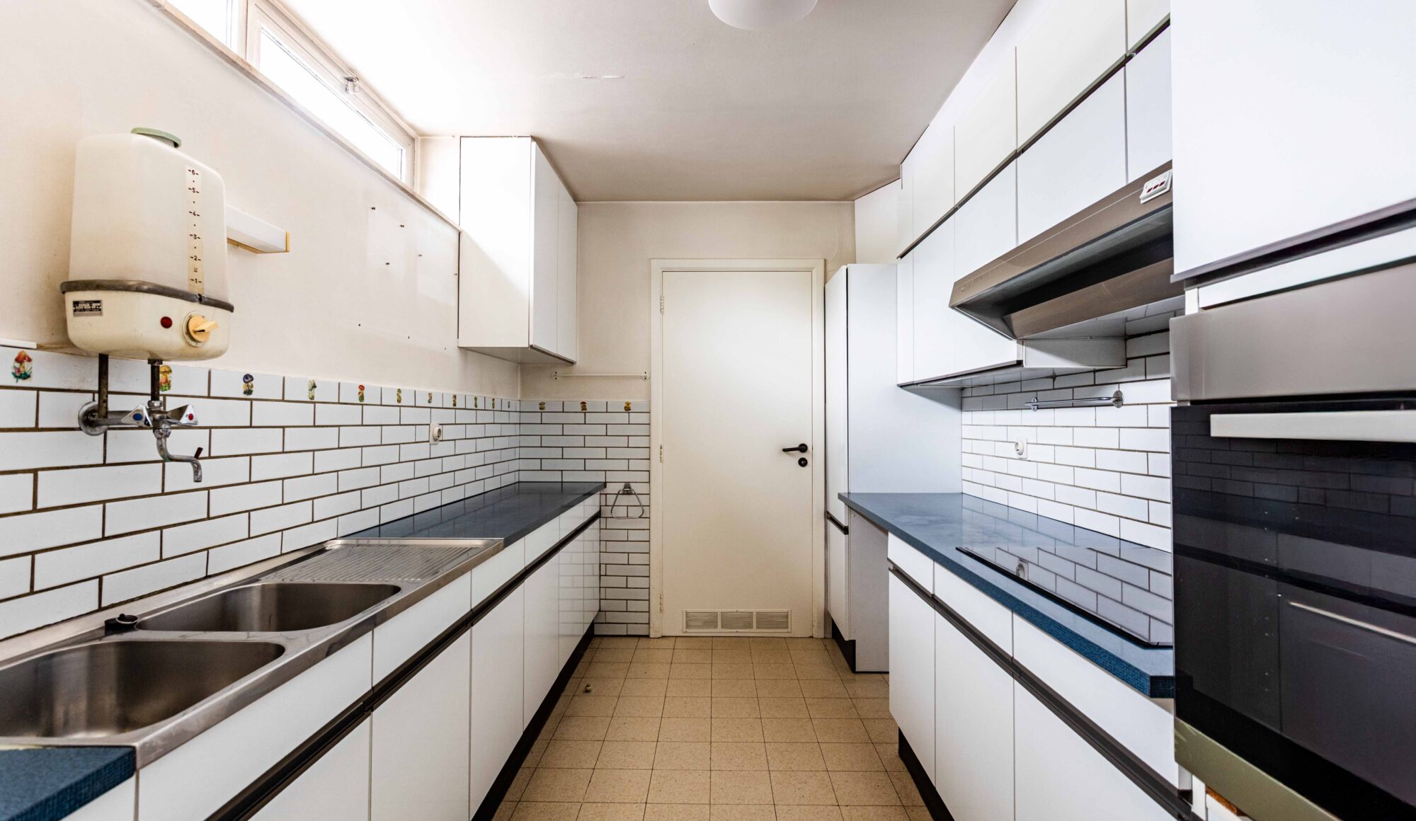Zoals het een echte architectenwoning betaamt, is de woning functioneel opgevat zonder in te boeten aan woonkwaliteit. De circulatie is efficiënt, met duidelijke overgangen tussen wonen, koken en slapen. De keuken is compact maar slim georganiseerd, nog steeds voorzien van originele kasten en tegels die verrassend goed bewaard zijn gebleven. Via een grote schuifpui komt het daglicht binnen in de woonkamer, terwijl het uitzicht op de besloten tuin met vijver en betonnen scheidingsmuur zorgt voor een gevoel van rust en verstilling. Buitenruimte en binnenruimte vloeien hier naadloos in elkaar over.