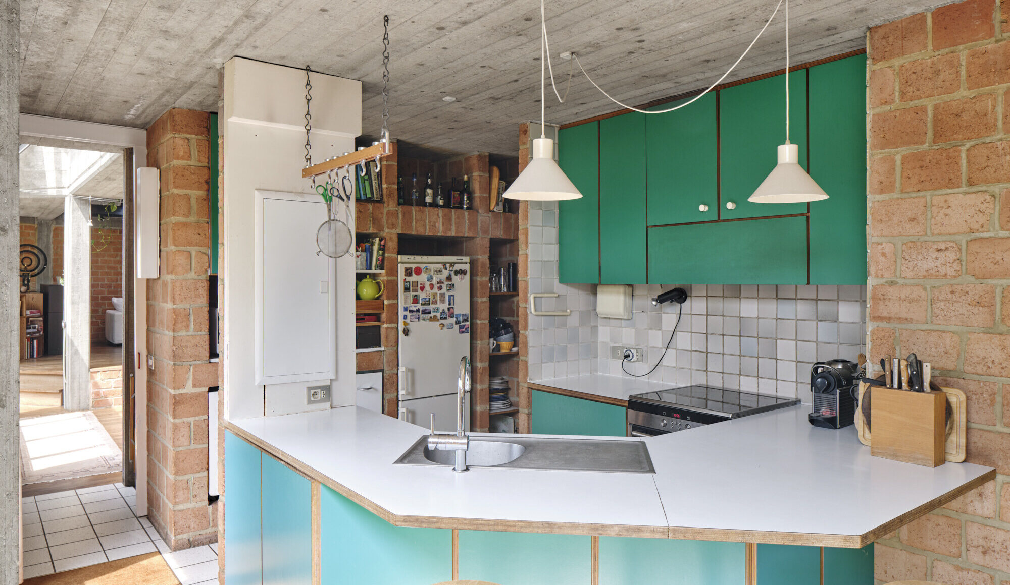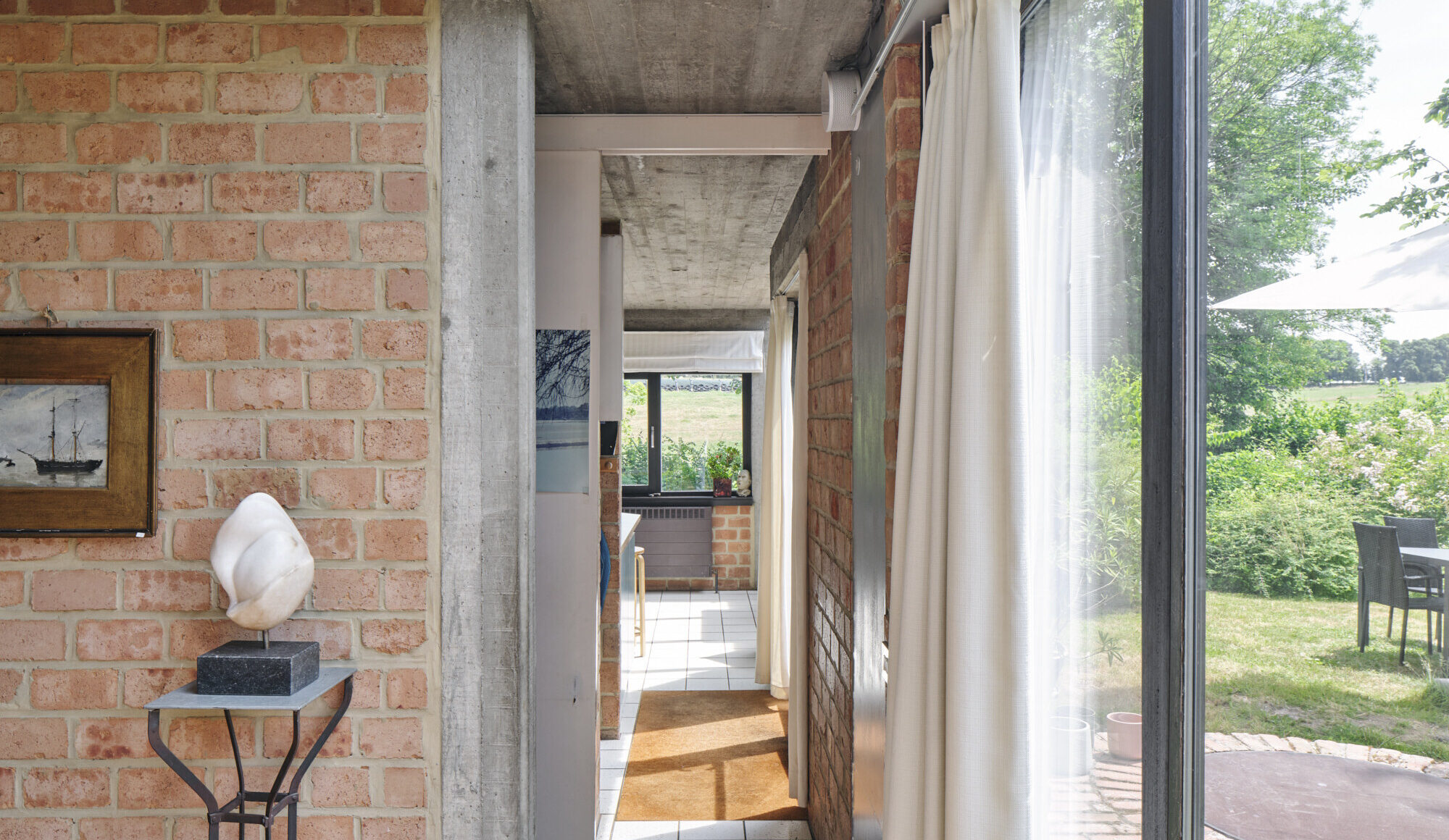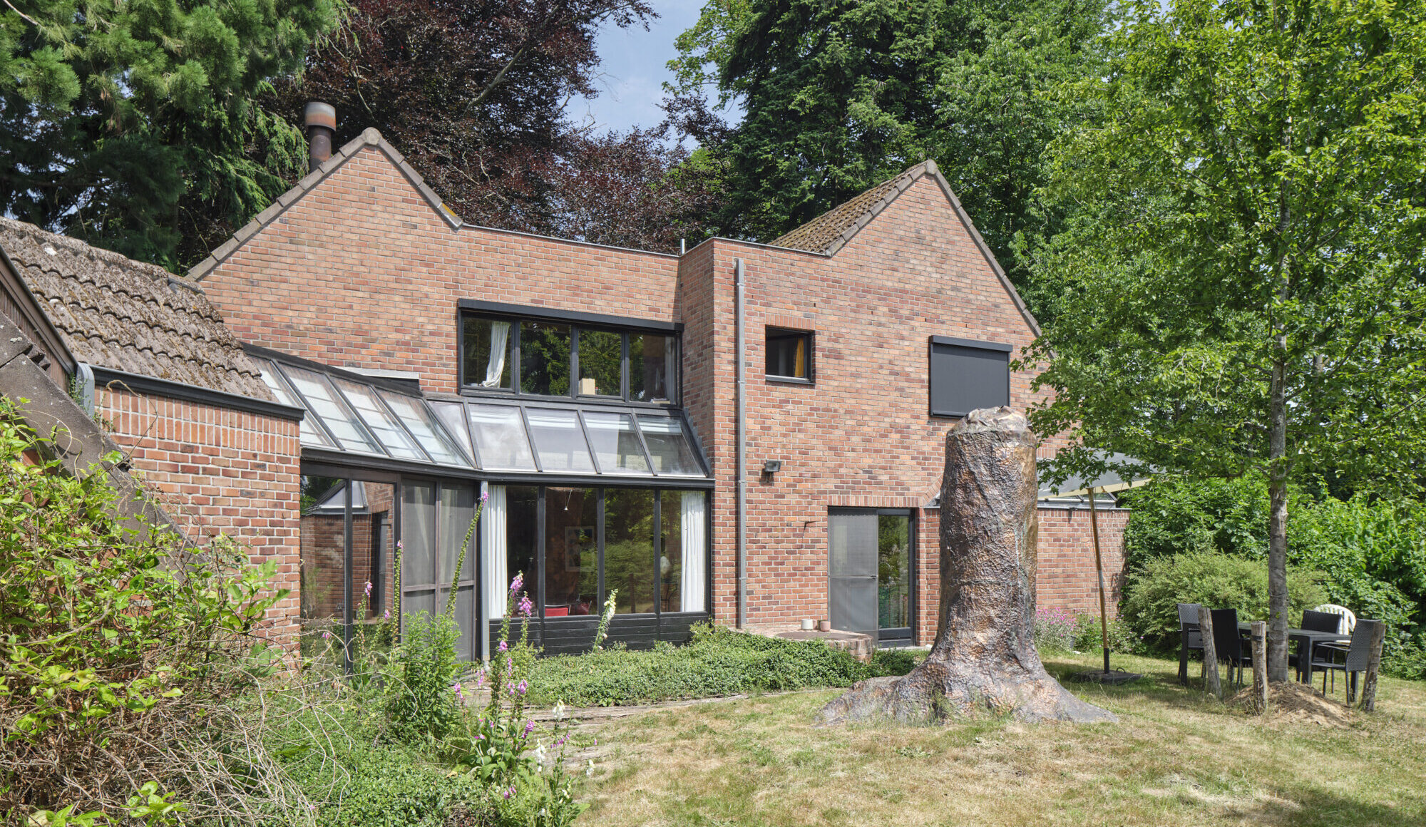 Te midden van een volgroeide tuin, verscholen achter een scherm van groen, ligt deze uitzonderlijke woning uit 1978. Het ontwerp is van de hand van Jozef Van den Broeck en Paul De Roo, twee Belgische architecten die in de jaren ’70 bekendstonden om hun genuanceerde benadering van wonen: rationeel in opbouw, maar met oog voor detail, beleving en menselijke schaal. Hun werk wordt gekenmerkt door een expressieve baksteenarchitectuur, doordachte oriëntatie en een subtiel spel van volumes, die samen een bijna sculpturale vormentaal opleveren.