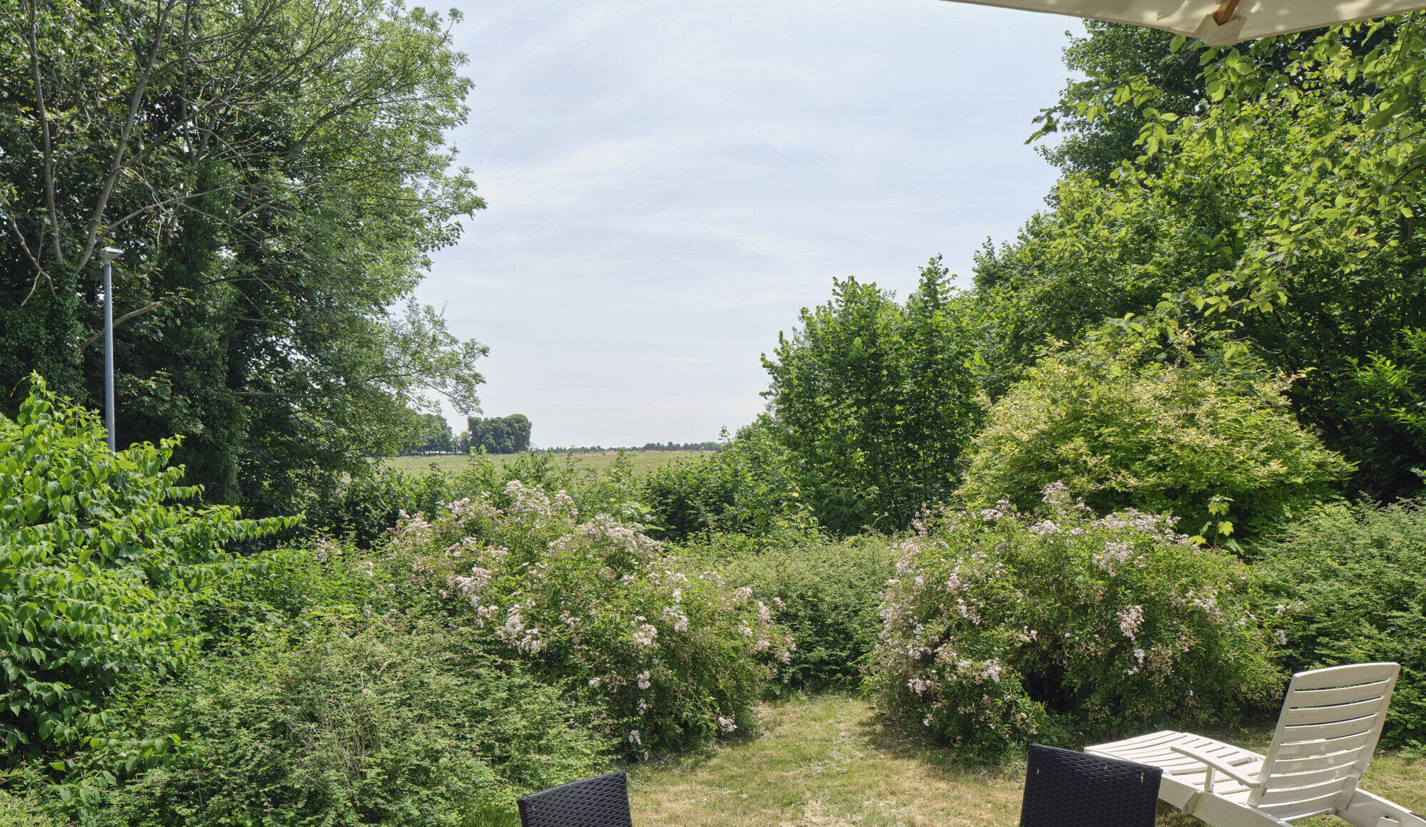 Vanuit elke ruimte is er contact met de omliggende tuin, die niet zomaar een buitenruimte is, maar integraal deel uitmaakt van het woonconcept. De woning werd bewust diagonaal op het perceel ingeplant, waardoor het zicht zich opent naar de tuin en het achterliggende landschap. De aanwezigheid van volwassen bomen – waaronder een imposante sequoia – versterkt het gevoel van beschutting en verbondenheid met de natuur. De overgang tussen binnen en buiten is nergens abrupt; overal vloeien de lijnen en materialen op natuurlijke wijze in elkaar over.