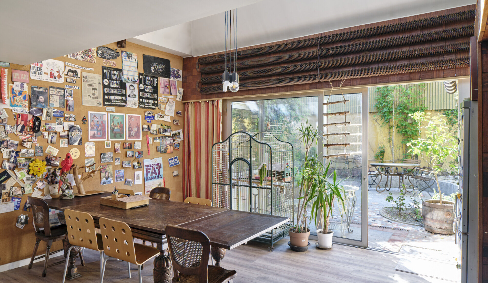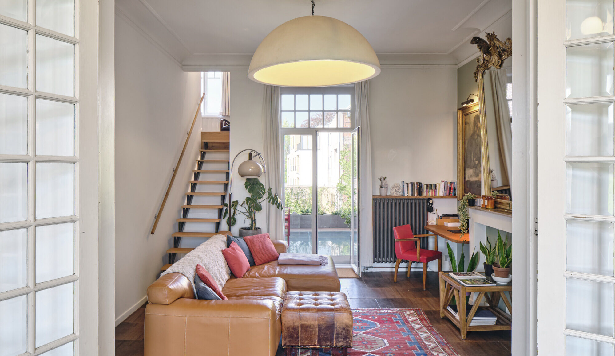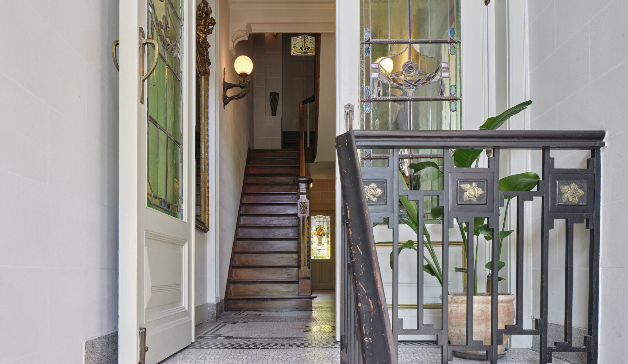Binnenin ontvouwt zich een woning die zich over meerdere niveaus uitstrekt. Het leefgedeelte begint enkele treden boven straatniveau, wat niet alleen zorgt voor verhoogd licht en privacy, maar ook ruimte schept voor een volwaardige benedenverdieping met o.a. een slaapkamer, bibliotheek en een royale badkamer. De inkomhal maakt meteen indruk met haar mozaïektegels, sierlijke trap en glas-in-loodramen die het daglicht filteren tot een zacht schouwspel.