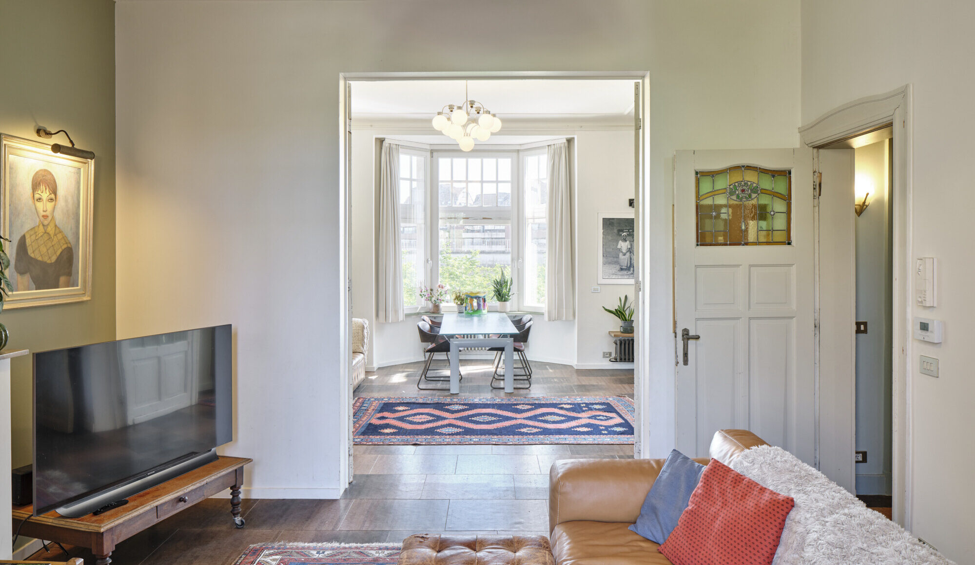 De leefruimtes op de hoofdverdieping zijn klassiek geproportioneerd en baden in het licht. De zitkamer sluit aan op een verhoogde glazen uitbouw met zicht op de tuin, terwijl de eetkamer via een erker mooi uitkijkt over het plein. De keuken straalt een ambachtelijke sfeer uit met haar betegeld werkblad en functionele indeling.