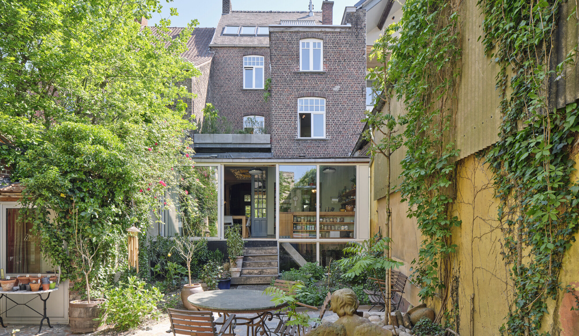 De stadstuin vormt een intiem en architecturaal interessant tussengebied. Hoge, begroeide muren en een kleurrijk gepleisterde gevel creëren een besloten sfeer die rust en ruimte biedt – als een openluchtkamer, centraal in het geheel. De tuin is niet enkel esthetisch waardevol, maar vormt ook een functionele schakel tussen woonhuis en achterbouw.