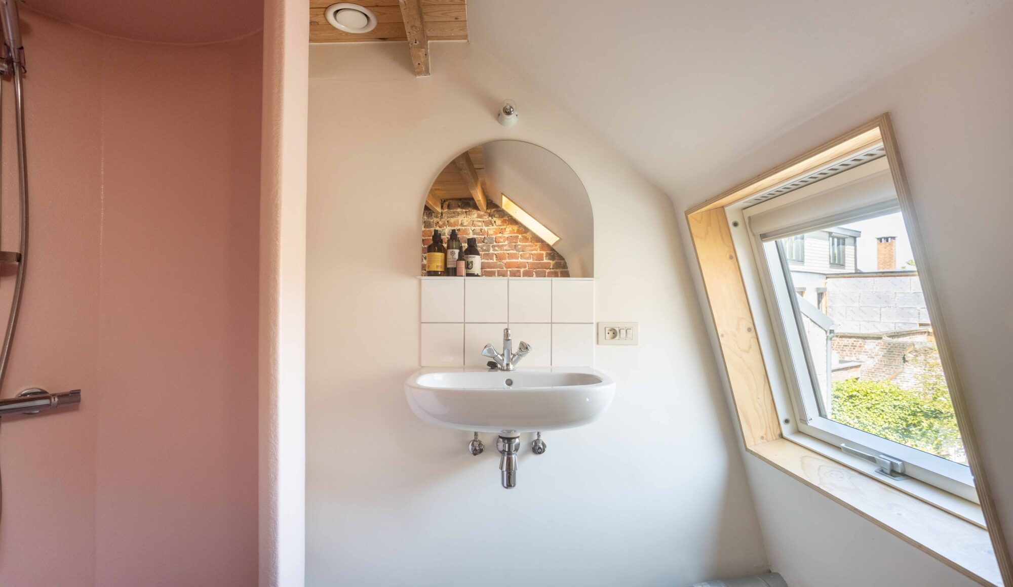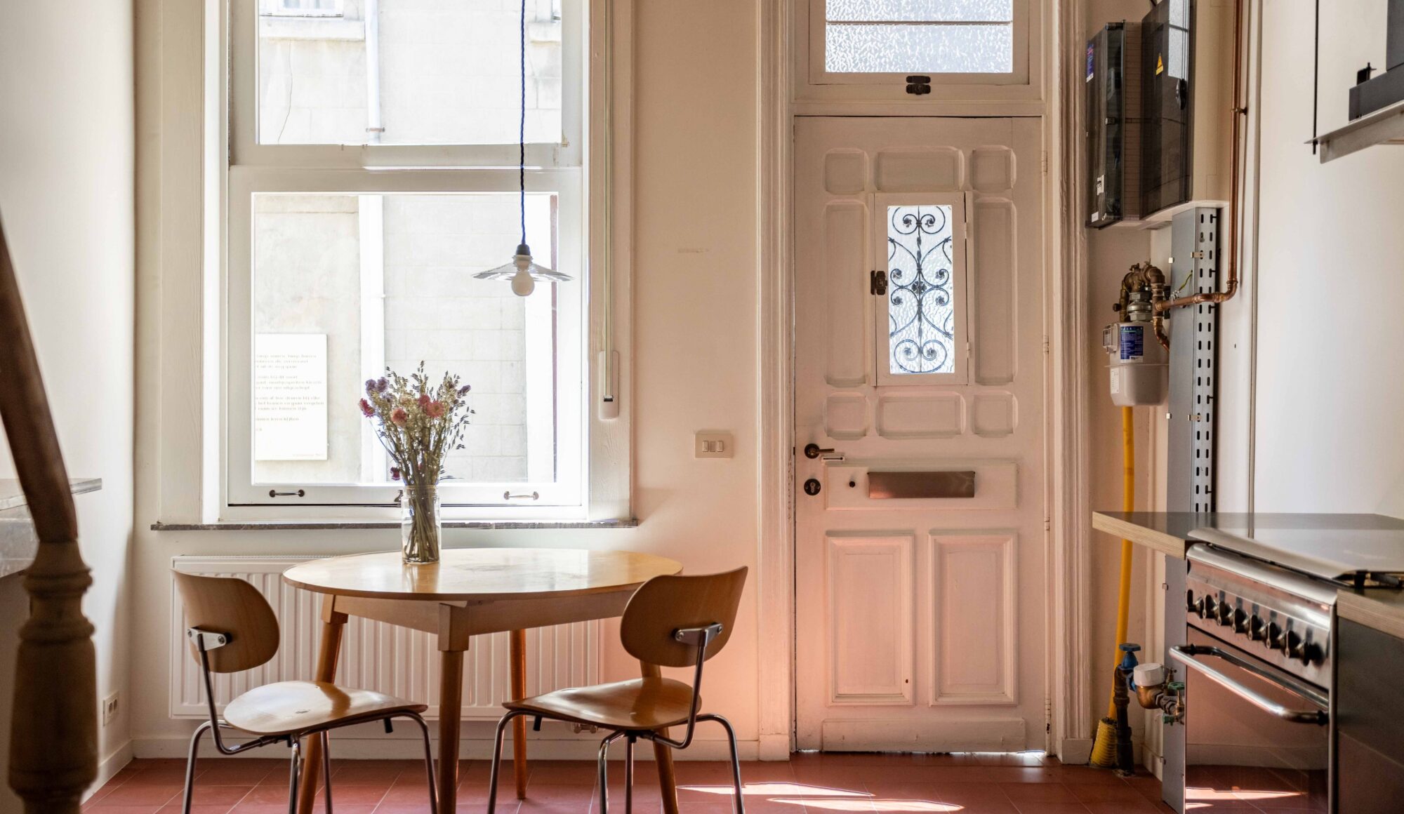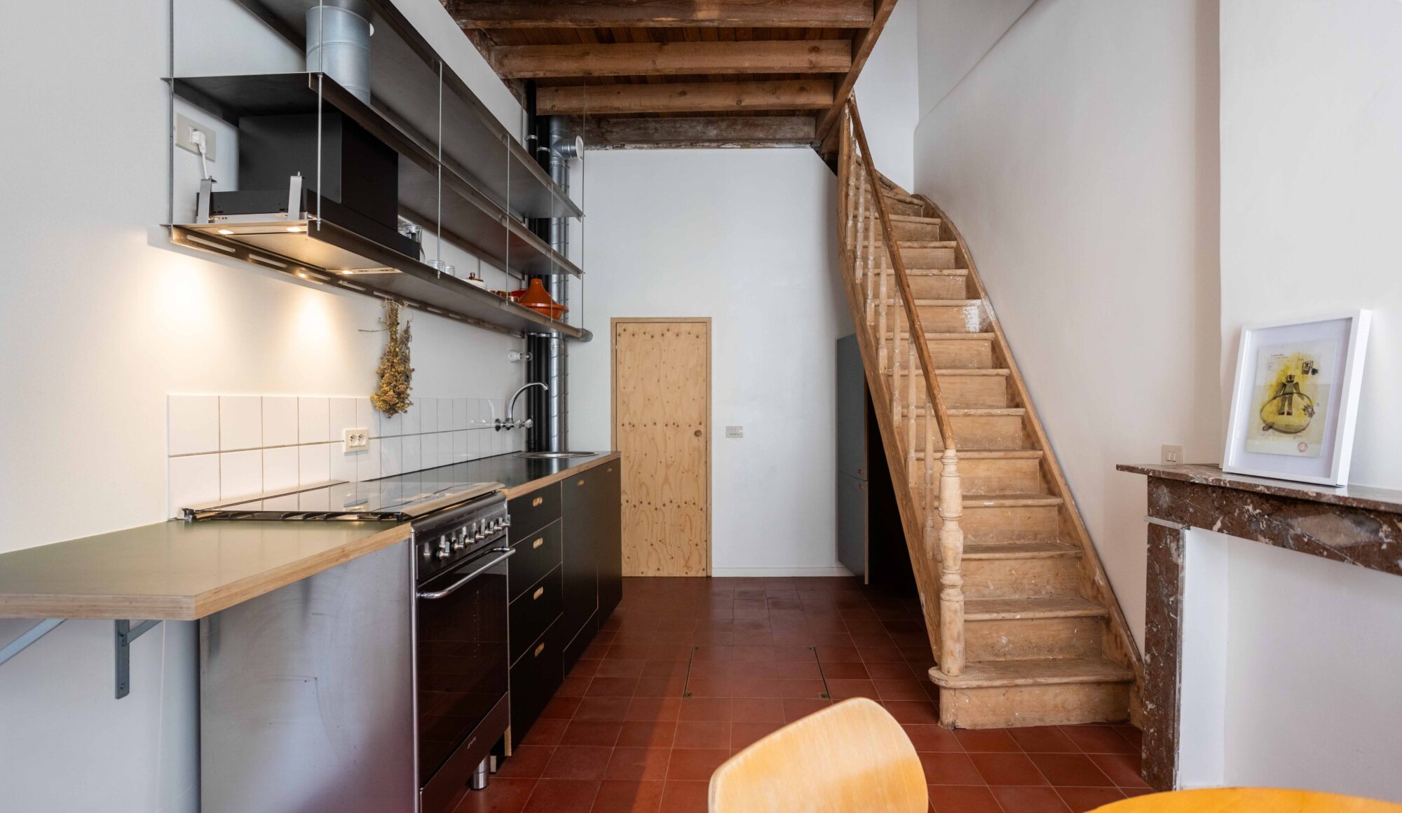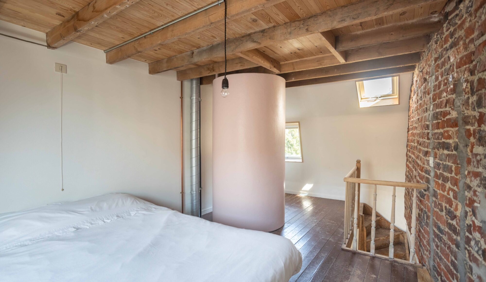 De woning is opgebouwd als een ‘verticaal appartement’, met drie heldere functies verdeeld over drie niveaus. Je komt binnen via de keuken en eetruimte op het gelijkvloers, waar rode cementtegels, donkergroene zelfontworpen keukenkastjes en een verborgen toilet onder de trap een onverwacht warme sfeer creëren. De leefruimte op de eerste verdieping is helder en open met veel natuurlijk licht. Het zichtbaar leidingwerk en de onafgewerkte muren benadrukken hier het ruwe karakter. Helemaal boven, onder het nieuwe inox dakkapel, bevindt zich de slaapruimte met een minimalistische inrichting en een op maat gemaakte roze polyester douche in het midden van de kamer.