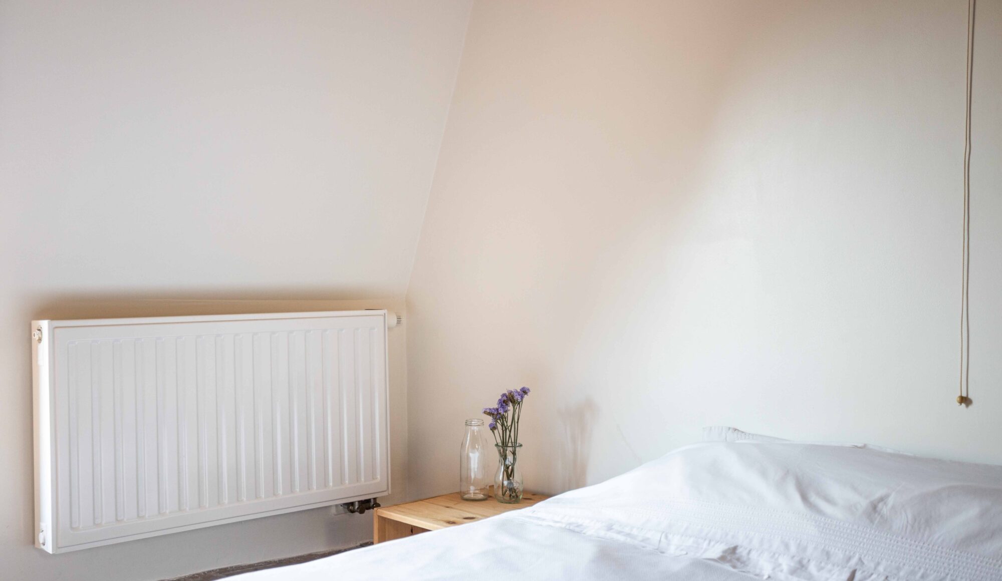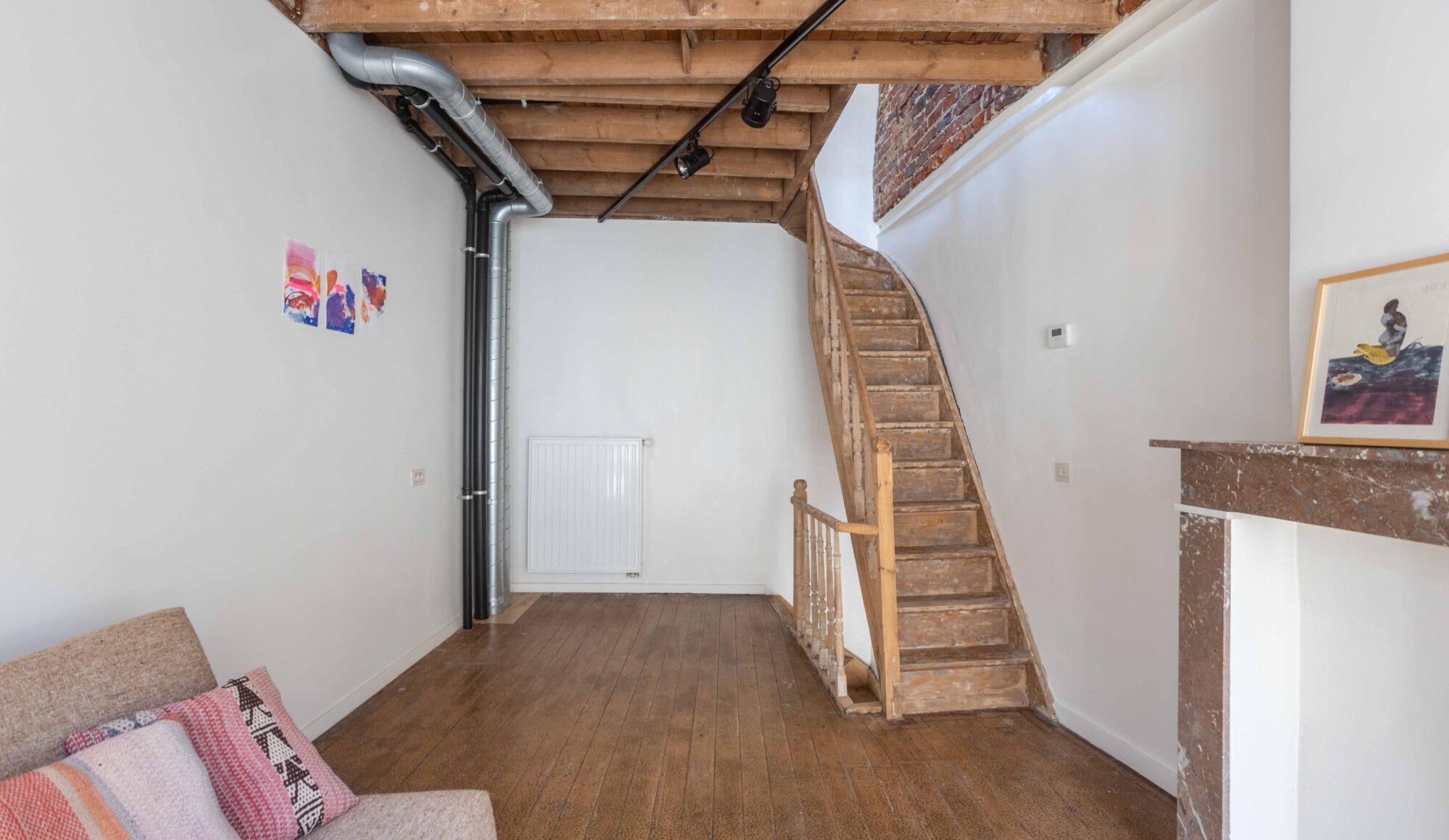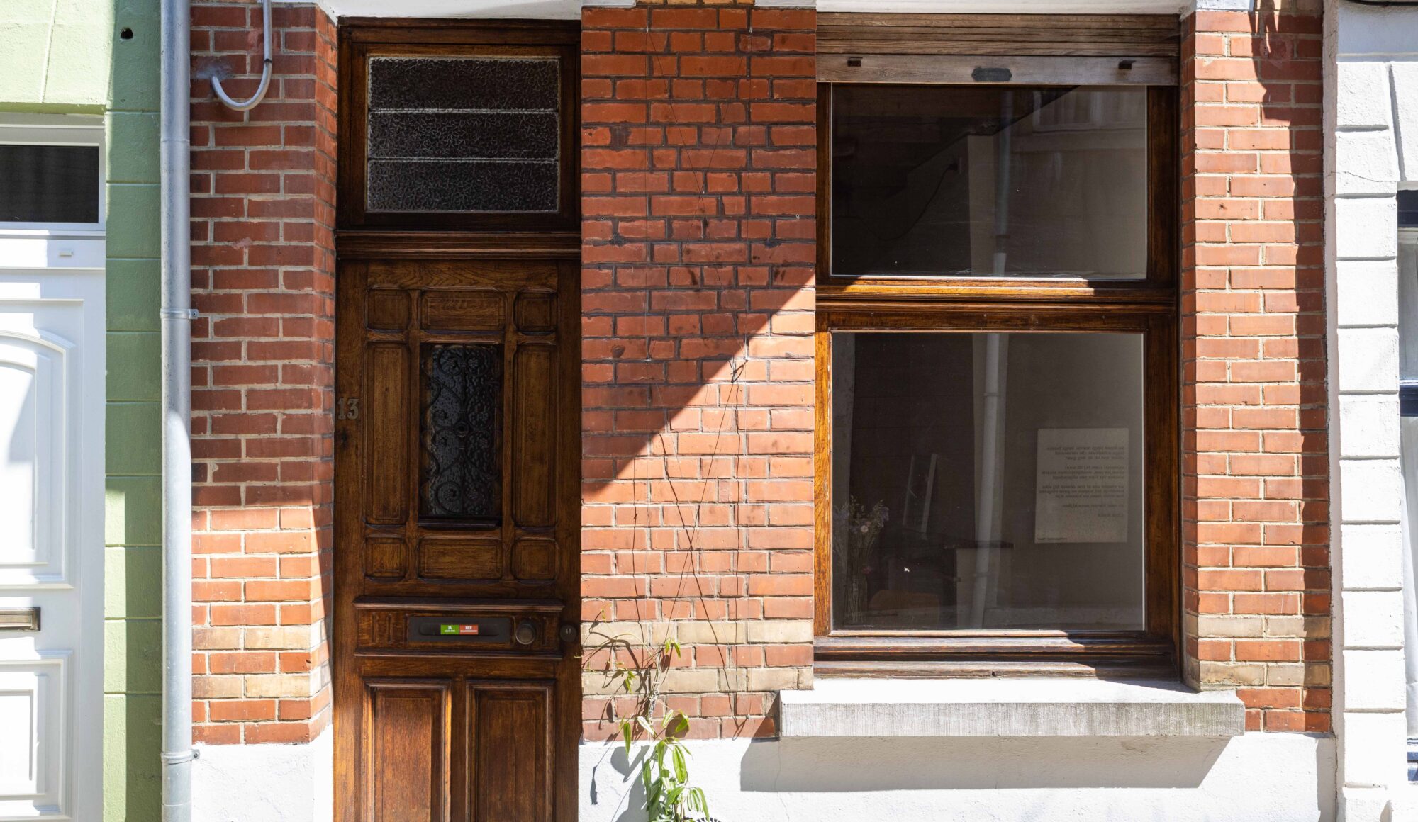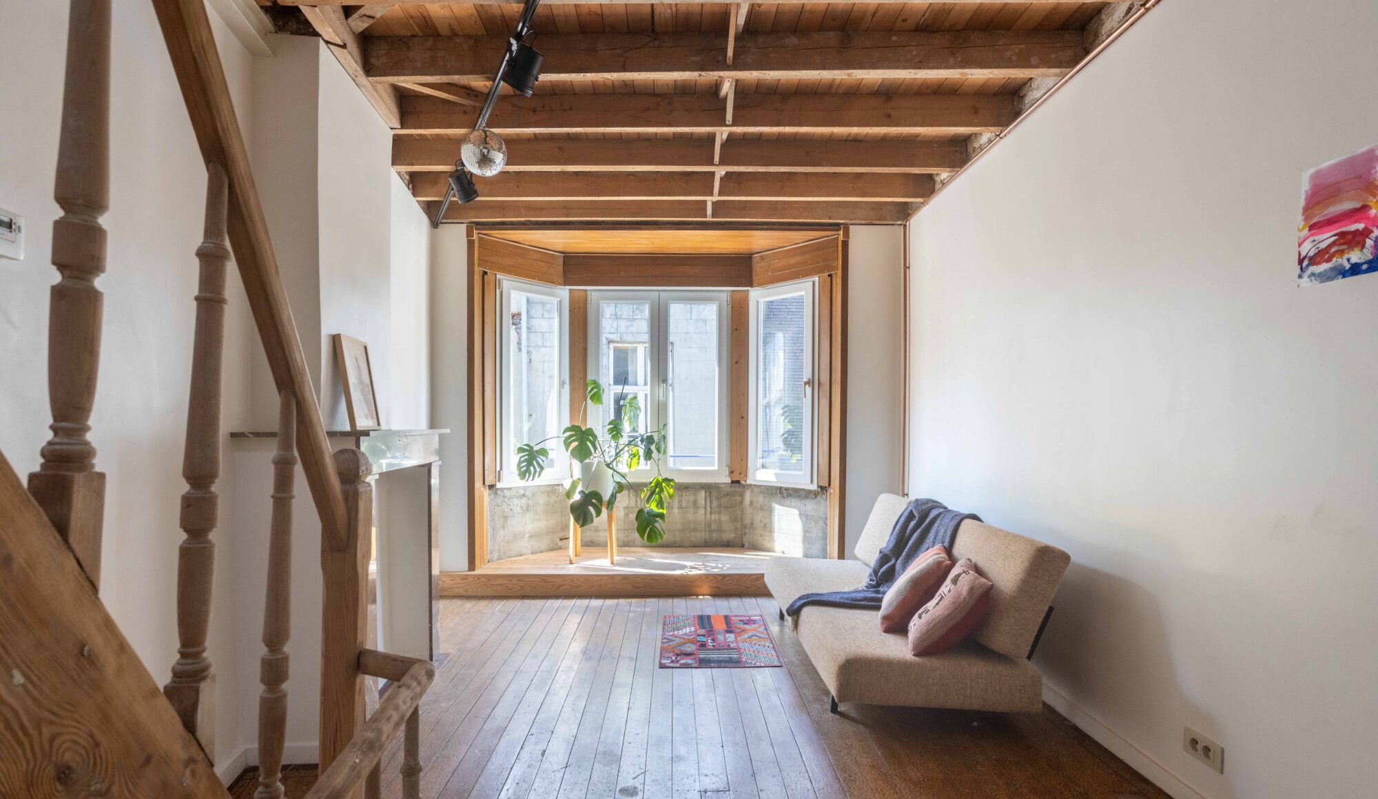 De woning is opgebouwd als een ‘verticaal appartement’, met drie heldere functies verdeeld over drie niveaus. Je komt binnen via de keuken en eetruimte op het gelijkvloers, waar rode cementtegels, donkergroene zelfontworpen keukenkastjes en een verborgen toilet onder de trap een onverwacht warme sfeer creëren. De leefruimte op de eerste verdieping is helder en open met veel natuurlijk licht. Het zichtbaar leidingwerk en de onafgewerkte muren benadrukken hier het ruwe karakter. Helemaal boven, onder het nieuwe inox dakkapel, bevindt zich de slaapruimte met een minimalistische inrichting en een op maat gemaakte roze polyester douche in het midden van de kamer.